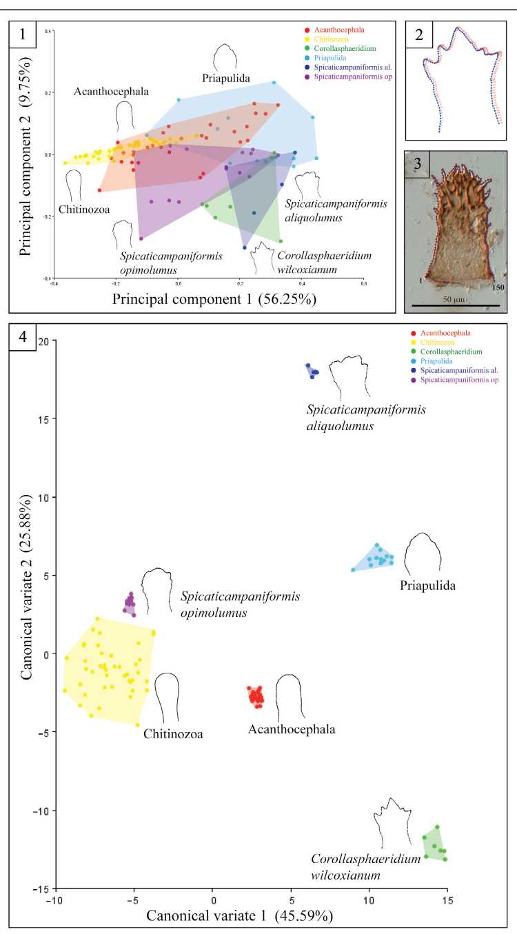 В каноническом вариативном анализе (по оригинальной выборке), который показывает максимальное разделение между группами, все виды родов Corollasphaeridium и Spicaticampaniformis отчетливо отделяются друг от друга (табл. III, фиг. 4). S. opimolumus максимально отделяется от C. wilcoxianum по первой вариативности (45.59%), отвечающей за ширину основания и выраженность апикального выроста. При этом S. opimolumus лежит рядом с группой хитинозой. S. aliquolumus максимально отличается от C. wilcoxianum по второй компоненте (25.88%), которая отвечает за форму апикальной части. Группа приапулид находится на графике между Spicaticampaniformis aliquolumus и Corollasphaeridium wilcoxianum, группа скребней равноудалена ото всех остальных групп.