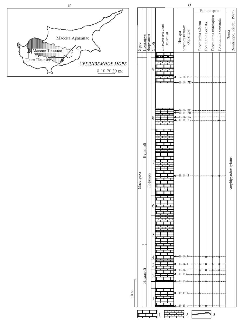 Рис. 1. Местонахождение изученных радиолярий на Кипре: а – схема расположения разреза; б – литологическая колонка разреза Пано Панайя (формация Лефкара, маастрихт). Обозначения: 1 – известняки; 2 – мергели; 3 – разлом Аракапас.