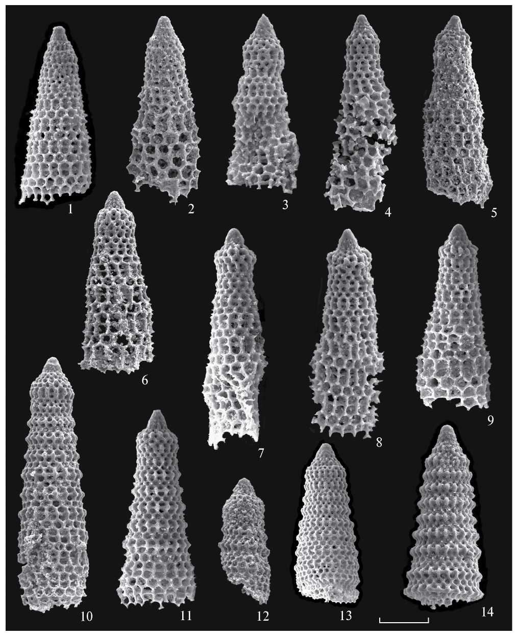 Кипр, формация Лефкара, разрез Пано Панайя, верхняя часть зоны Amphipyndax tylotus, верхняя часть нижнего маастрихта: обр. 19-13-1 (фиг. 12), 19-13-4 (фиг. 5), обр. 19-14-1 (фиг. 2, 6, 10), обр. 19-14-3 (фиг. 1, 3, 4, 8, 9, 11, 14), обр. 19-14-5 (фиг. 7); верхняя часть зоны Amphipyndax tylotus, предположительно нижняя часть верхнего маастрихта: обр. 19-14-13 (фиг. 13). Длина масштабной линейки 100 мкм.