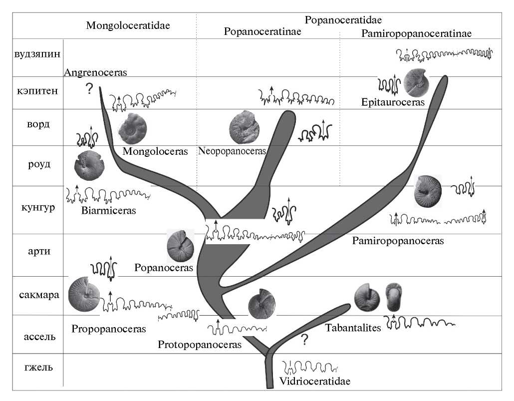 Ранее мы с коллегами (Леонова и др., 2005) опубликовали свои представления о позднем филогенезе надсемейства Popanoceratoidea Hyatt, 1900: кунгурско – роудско – кэпитенскую историю двух семейств, Popanoceratidae Hyatt, 1900 и Mongoloceratidae Ruzhencev et Bogoslovskaya, 1978. Это исследование было инициировано находками в казанских отложениях Волго-Уральского района новых роудских попаноцератоидей, нужно было установить их место в системе и родственные связи. Сейчас, при изучении раннепермских аммоноидных комплексов Стерлитамакских шиханов, появились вопросы, которые потребовали современного исследования самых ранних представителей семейства. Проведенная работа привела к переосмыслению взглядов на происхождение всех попаноцератоидей и позволила сформировать новые гипотезы о предковых формах и раннем филогенезе семейства Popanoceratidae (рис. 1).