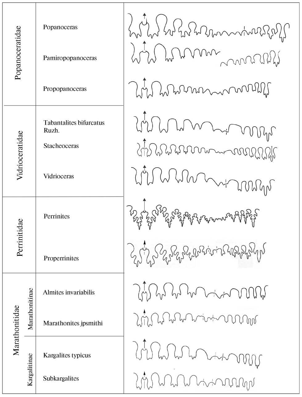 Рис. 2. Строение внутренних частей лопастных линий (изменение ширины дорсальной лопасти и слияние внутренних боковых) в филогенезе: Marathonitidae (по: Miller, Furnish, 1940; Руженцев, 1956), Perrinitidae (по: Miller, Furnish, 1940), Vidrioceratidae (по: Руженцев, 1950, 1952; Miller, Furnish, 1940) и Popanoceratidae (по: Руженцев, 1951, 1956; Леонова, Дмитриев, 1989).