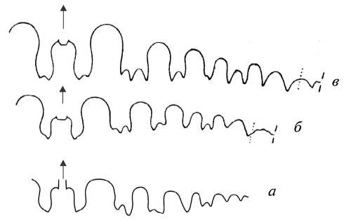 Рис. 3. Некоторые стадии онтогенеза лопастной линии Propopanoceras simense Ruzhencev: а – экз. ПИН, № 472/167 при В = 3.7 мм (×10), б – экз. ПИН, № 472/159 при В = 5.0 мм (×10), в – экз. ПИН, № 472/163 при В = 11.2 мм (×5) (б и в – по: Руженцев, 1951).
