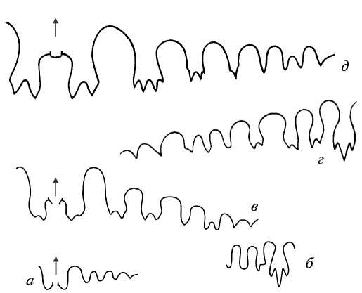 Рис. 4. Некоторые стадии онтогенеза лопастной линии Pamiropopanoceras meridionalis Leonova: а–в – экз. ПИН, № 3591/504: а – при В = 2.7 мм (×10), б – внутренняя часть при В = 4.0 мм (×10), в – при В = 4.4 мм (×5); г – экз. ПИН, № 3591/337, внутренняя часть при В = 16.5 мм (×5); д – экз. ПИН, № 3591/325 при В = 14.1 мм (×5) (г и д – по: Леонова, Дмитриев, 1989).