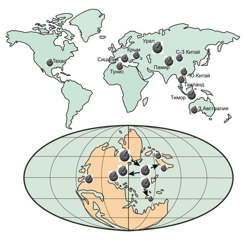 Находки попаноцератид известны из пермских отложений всех континентов, кроме Южной Америки (рис. 5). Вместе с тем, местонахождения их довольно редки и обычно не отличаются массовостью находок. Исключением является Южный Урал, где в сакмарских и артинских отложениях были произведены наиболее богатые сборы (более 150 экз. Propopanoceras и около 2500 экз. Popanoceras). Вторым по числу найденных попаноцератид можно назвать Памир, особенно его юго-восточную часть. Здесь в верхнеартинско – кунгурских отложениях собрано немногим более сотни попаноцератид (восемь экз. Popanoceras и 110 экз. Pamiropopanoceras). В остальных местонахождениях их находки единичны: на о-ве Тимор описаны один экз. Propopanoceras, несколько экз. Popanoceras и 60–65 экз. Pamiropopanoceras; кроме этого, в амарассии (граница кэпитена и вудзяпиня) найден Epitauroceras [в описании указано три экз. из колл. Ун-та Айовы, плюс несколько экз. в Музее естественной истории в Лондоне (Glenister, Furnish, 1988)]. К сожалению, богатые коллекции аммоноидей, собранные на Тиморе большой группой исследователей (Charlton et al., 2002), монографически не изучены; до сих пор не опубликованы ни их описания, ни изображения, а определения сделаны на уровне начала прошлого века.