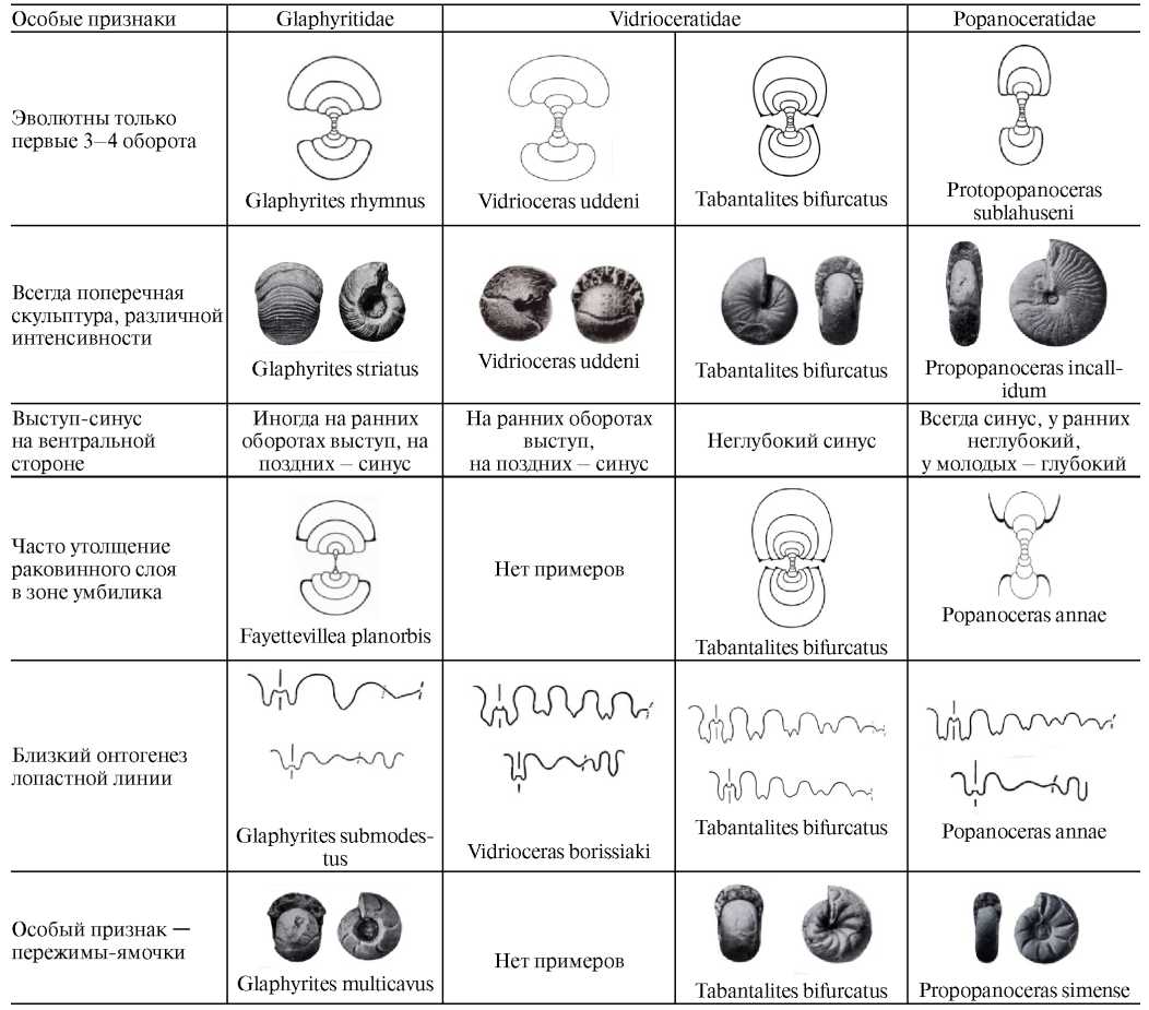 Таким образом, все перечисленные признаки противоречат выводу о происхождении попаноцератоидей от неоикоцератид (Eoasianites), а скорее свидетельствуют о сходстве наследованных черт с семейством Vidrioceratidae, а через него – с глафиритидами.