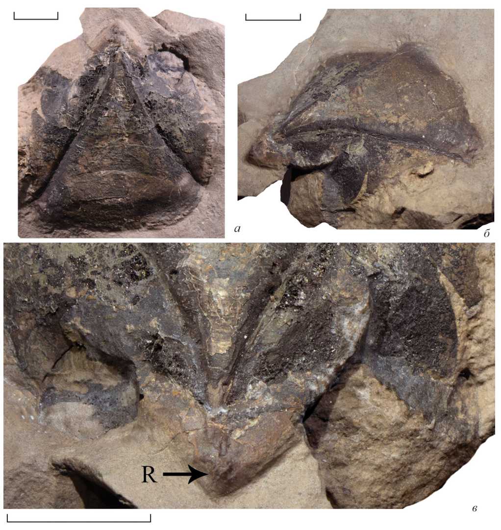 Рис. 4. Верхняя челюсть Lytoceras (Thysanolytoceras) sp., экз. ПИН, № 5546/404: а – сверху, б – сбоку, в – передняя часть крупным планом; Карачаево-Черкессия, Зеленчукский р-н, пр. берег р. Кяфар ниже ст. Сторожевая, местонахождение № 17; верхний байос, зона Strenoceras niortense, подзона Baculatoceras baculatum, фаунистический горизонт baculatum. Обозначение: R – ринхолит Длина масштабной линейки 10 мм.