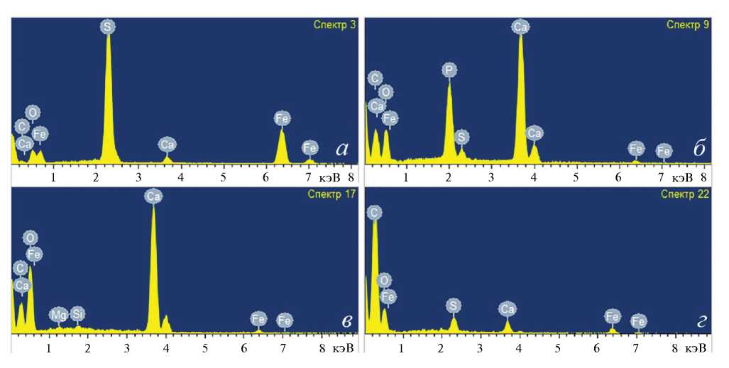 Рис. 5. EDX-спектры различных частей челюсти Lytoceras (Thysanolytoceras) sp.: а – пиритизированный участок в середине челюсти, б – фосфатизированная основная часть челюсти, в – кальцитовый ринхолит, г – углефицированные участки в бороздах по бокам центральной части челюсти.