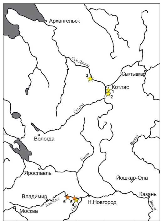 Рис. 1. Расположение верхнепермских местонахождений с остатками Kotlassia prima Amalitzky, 1921: 1 – Соколки (Архангельская обл.; вятский ярус, нефедовский горизонт, саларевская свита, комарицкая пачка), 2 – Элеонора (Архангельская обл.; вятский ярус, саларевская свита, нефедовский горизонт, верхняя часть комарицкой пачки), 3 – Раша (Архангельская обл.; вятский ярус, саларевская свита), 4 – Гороховец (Владимирская обл.; верхняя пермь, вятский ярус, нефедовский горизонт, обнорская свита), 5 – Жуков Овраг-1-A (Владимирская обл.; вятский ярус, жуковский горизонт), 6 – Быковка (Владимирская обл.; вятский ярус, жуковский горизонт).