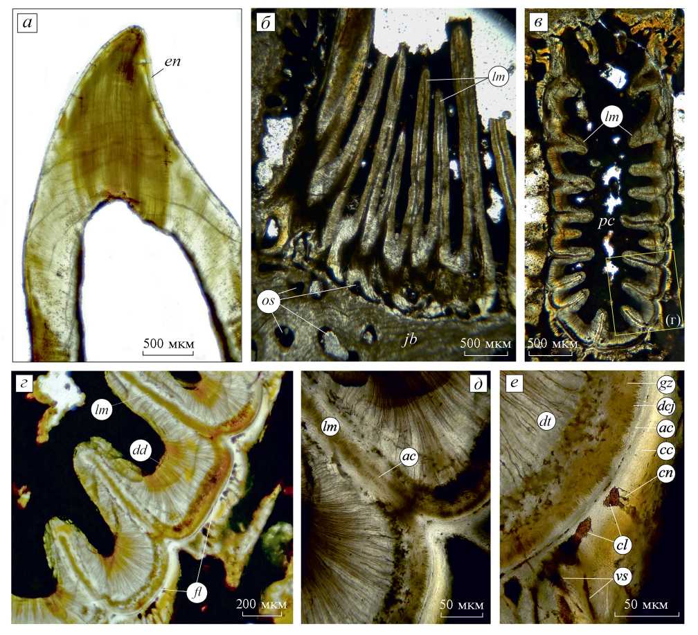 Рис. 3. Kotlassia prima Amalitzky, 1921, экз. ПИН, № 4818/615, гистологические срезы нижнечелюстных зубов из местонахождения Гороховец: а, б – вертикальный через вершину зуба (плоскость сечения ориентирована лабио-лингвально): а – коронарная часть зуба с упорядоченно-сигмоидальной структурой дентиновых тубулей; б – базальная часть зоны имплантации, демонстрирующая ширину и протяженность ламелей, отсутствие альвеолярной костной ткани в базальном положении и характер васкуляризации челюстной костной ткани в месте крепления основания; в–е – поперечный срез, в 1 мм выше уровня крепления к кости: в – общий вид сечения, демонстрирующий число, форму и распределение складок и ламелей (сечение ориентировано лабиальной стороной вверх); г – увеличенное изображение складок лингвальной части основания; д – особенности гистологии осевой части ламели; е – стратификация дентина и цемента в осевой части складки. Обозначения: ac – бесклеточный (acellular) цемент, cc – клеточный (cellular) цемент, cl – лакуны остеоцитов, cn – полости каналикулей, dcj – граница дентина и бесклеточного цемента, dd – области плотной упаковки тубулей в ядрах складок (“dark dentine”), dt – дентиновые тубули, en – эмаль, fl – складки, gz – гранулярный слой Томаса, lm – ламели, os – остеоны, vs – сосудистые каналы в толще клеточного цемента.