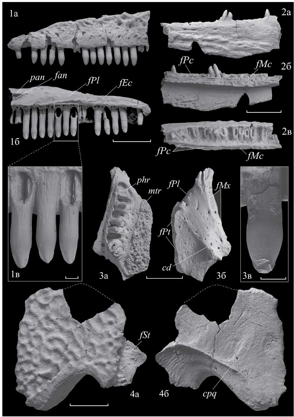 Фиг. 1–4. Kotlassia prima Amalitzky, 1921, краниальные остатки из местонахождения Гороховец (Владимирская обл.; верхняя пермь, нефедовский горизонт): 1 – экз. ПИН, № 4818/1100, правое maxillare: 1а – латерально, 1б – медиально, 1в – часть зубного ряда с лингвальной стороны; 2 – экз. ПИН, № 4818/615, левое dentale: 2а – латерально, 2б – медиально, 2в – сверху; 3 – экз. ПИН, № 4818/614, правое ectopterygoideum: 3а – вентрально, 3б – дорсально, 3в – зуб постхоанного зубного ряда с лингвальной стороны; 4 – экз. ПИН, № 4818/881, левое squamosum: 4а – дорсально, 4б – вентрально. Обозначения: cd – дорсальный гребень; cpq – crista paraquadrata; f – площадки причленения (Mc – mediocoronoideum, Mx – maxillare, Ec – ectopterygoideum, Pc – postcoronoideum, Pl – palatinum, Pt – pterygoideum, St – supratemporale); fan – fossa antorbitalis; mtr – медиальное зубное поле; pan – processus antorbitalis; phr – постхоанный зубной ряд. Длина масштабных линеек – 1 см; для фиг. 1в и 3в – 1 мм.