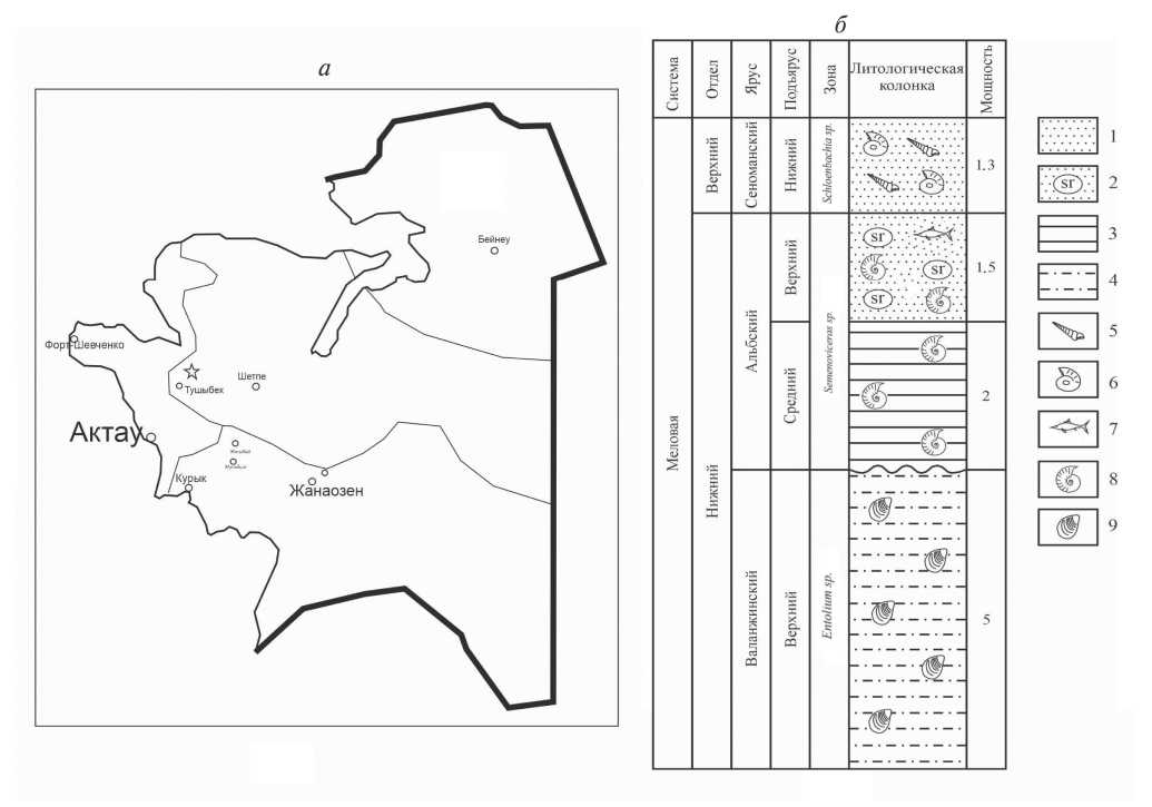 Рис. 1. Местонахождение фрагментов скелета Platypterygius sp. indet: а – местоположение разреза Тушыбек, место находки отмечено звездочкой; б – схематическая литолого-стратиграфическая колонка местонахождения. Обозначения: 1–4 – литологическая характеристика: 1 – пески, 2 – пески с конкрециями сидерита, 3 – глины, 4 – алевролиты; 5–9 – палеонтологическая характеристика: 5 – Turrilites, 6 – Schloenbachia sp., 7 – Platypterygius sp. indet., 8 – Semenoviceras sp., 9 – Entolium sp.