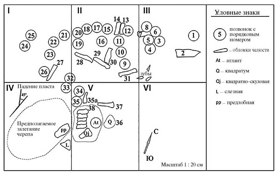 Фрагменты скелета были извлечены авторами при участии российского палеонтолога В.М. Ефимова, сотрудников Мангистауского областного историко-краеведческого музея им. А. Кекильбаева (МОИКМ) и палеонтологов-любителей В.А. Ярцева и С.А. Мамонтова. Схема залегания костей показана на рис. 2. При раскопках не удалось вскрыть все захоронение, т.к. пласты песчаника с костями опускаются под углом 45° и сильно цементируются; в извлеченных блоках черепные кости сильно раздроблены. Препарирование костей скелета было проведено в исследовательской лаборатории природного наследия, геоботаники и мониторинга биоразнообразия отдела науки Западно-Казахстанского ун-та им. М. Утемисова (ЗКУ) одним из авторов (Д.Б. Якуповой). После изучения и реставрации отдельных костей оригиналы были переданы в МОИКМ, г. Актау, где они хранятся под № КП-7409/1–44.