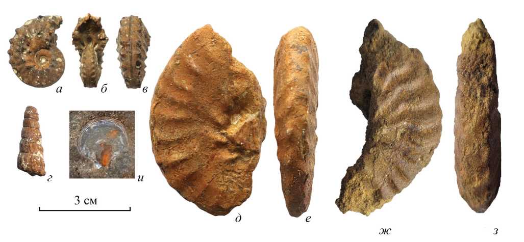 Рис. 3. Беспозвоночная фауна альба разреза Тушыбек: а–в – Schloenbachia sp.; г – Turrilites sp.; д–з – Semenoviceras sp.; и – Entolium sp.