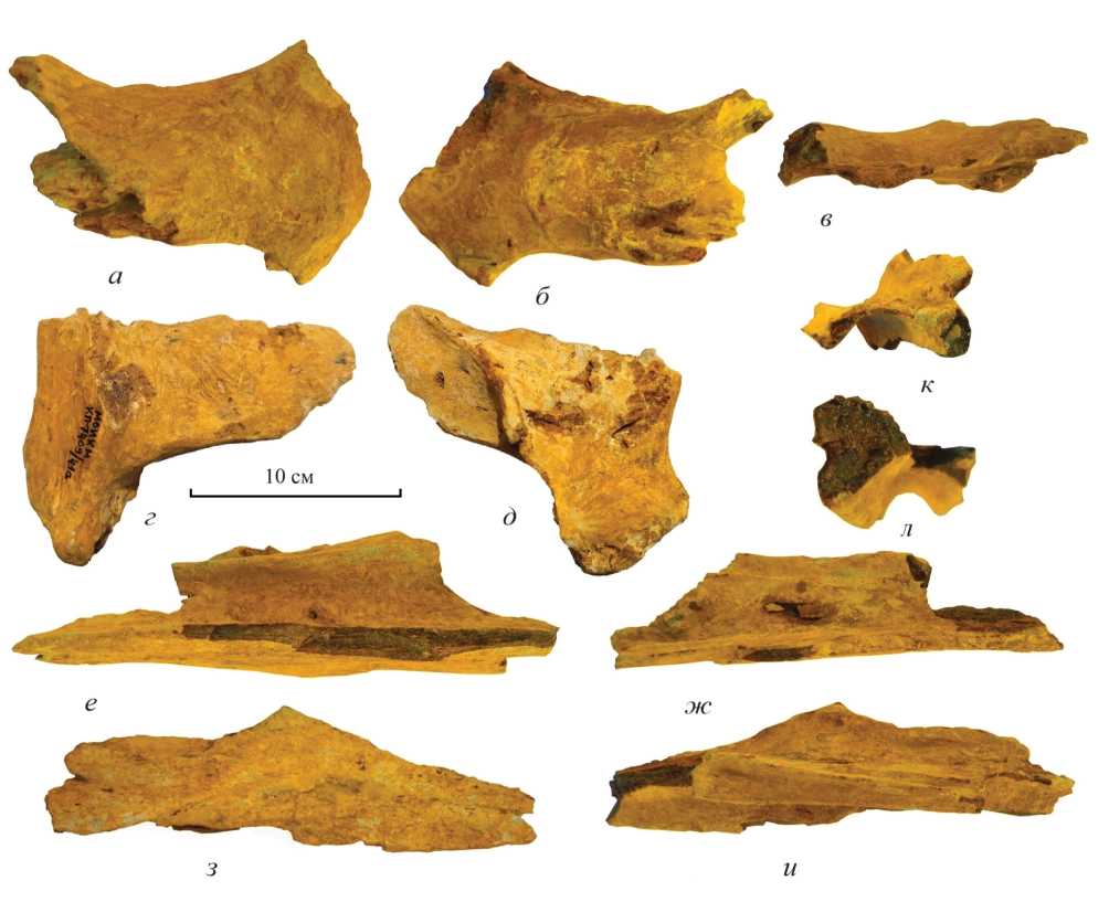 Рис. 4. Кости черепа Platypterygius sp. indet. из альба разреза Тушыбек: а–в – теменная кость, экз. МОИКМ, № КП-7409/41б: а – дорсальный вид, б – вентральный вид, в – латеральный вид; г, д – надвисочная кость, экз. МОИКМ, № КП-7409/41а: г – дорсальный вид, д – вентральный вид; е–л – верхнечелюстная кость, экз. МОИКМ, № КП-7409/41в: е – вид снизу, ж – вид сверху, з – вид сбоку, и – вентральный вид, к – сзади, л – спереди.