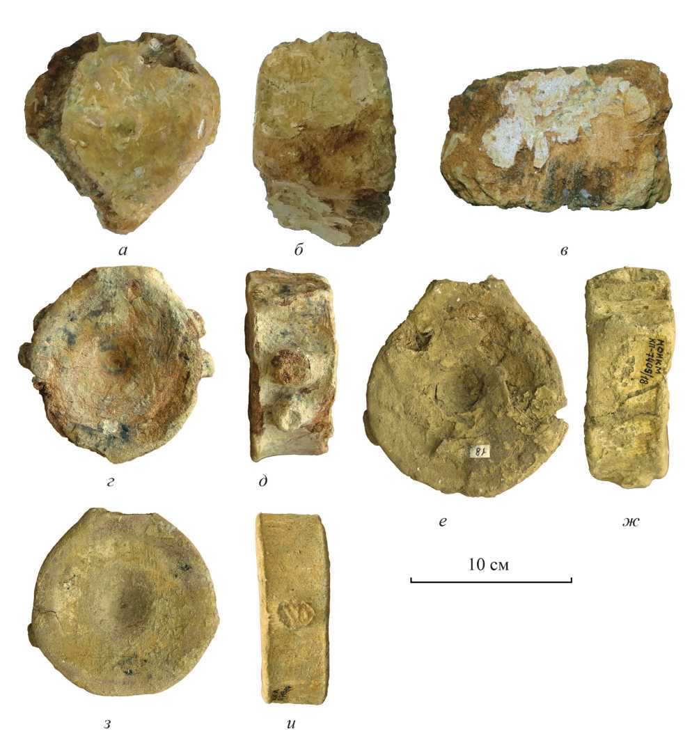 Рис. 5. Позвоночные тела Platypterygius sp. indet. из альба разреза Тушыбек: а–в – атлант и эпистрофей, экз. МОИКМ, №КП-7409/1: а – вид спереди, б – вид сбоку, в – вид сверху; г, д – переднетуловищный позвонок, экз. МОИКМ, №КП-7409/12: г – вид спереди, д – вид сбоку; е, ж – заднетуловищный позвонок, экз. МОИКМ, №КП-7409/24: е – вид спереди, ж – вид сбоку; з, и – переднехвостовой позвонок, экз. МОИКМ, № КП-7409/30: з – вид спереди, и – вид сбоку.