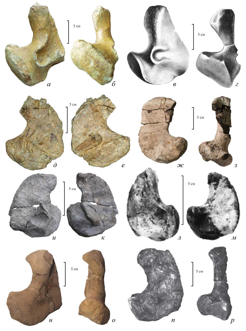 Рис. 6. Сравнение квадратных костей ихтиозавров семейства Platypterygiidae: а, б – правая квадратная кость Platypterygius sp. indet., экз. МОИКМ, № КП-7409/43: а – медиальный вид, б – вид сзади; в, г – левая квадратная кость Platypterygius platydactylus; в – медиально, г – вид сзади; д, е – левая квадратная кость Platypterygius sp. (Adams, Fiorillo, 2011): д – медиальный вид, е – латеральный вид; ж, з – левая квадратная кость Acamptonectes densus (Fischer et al., 2012): ж –латеральный вид, з – вид сзади; и, к – правая квадратная кость Sisteronia seeleyi (Fischer et al., 2014b): и – медиальный вид, к – латеральный вид; л, м – Platypterygius australis Wade, 1990 (по: Kear, 2005): л – медиальный вид, м – латеральный вид; н, о – левая квадратная кость Undorosarus nessovi (по: Zverkov, Efimov, 2019): н – медиальный вид, о – вид сзади; п, р – Grendelius alekseevi (по: Zverkov et al., 2015): п – медиальный вид, р – вид сзади.