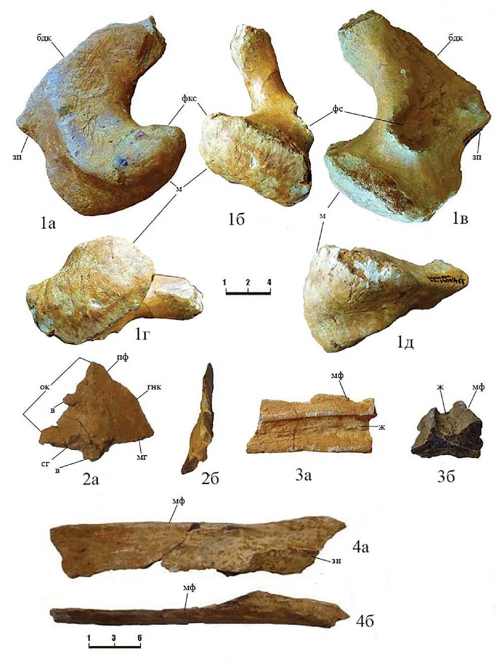 Фиг. 1–4. Platypterygius sp. indet.: 1 – экз. МОИКМ, № КП-7409/43, квадратная кость: 1а – латеральный вид, 1б – вид сзади, 1в – медиальный вид, 1г – постеровентрально, 1д – антеровентрально; 2 – экз. МОИКМ, № КП-7409/37, правая слезная кость: 2а – латеральный вид, 2б – вид спереди; 3 – экз. МОИКМ, №КП-7409/42, фрагмент зубной кости: 3а – проксимальный вид, 3б – поперечный профиль; 4 – экз. МОИКМ, № КП-7409/38, фрагмент центральной части правой носовой кости: 4а – вид сбоку, 4б – вид сверху; Казахстан, Мангистауская обл., разрез Тушыбек; нижний мел, альб. Обозначения: бдк – бороздчатый дорсальный край; в – вырост; зн – задний край носовой кости; гнк – грань носовой кости; ж – желоб для зубов; зп – задняя поверхность; м – мыщелок; мг – медиальная грань; мф – медиальная фасетка; ок – орбитальный край; пф – предлобная фасетка; сг – скуловая грань; фкс – фасетка квадратно-скуловой кости.