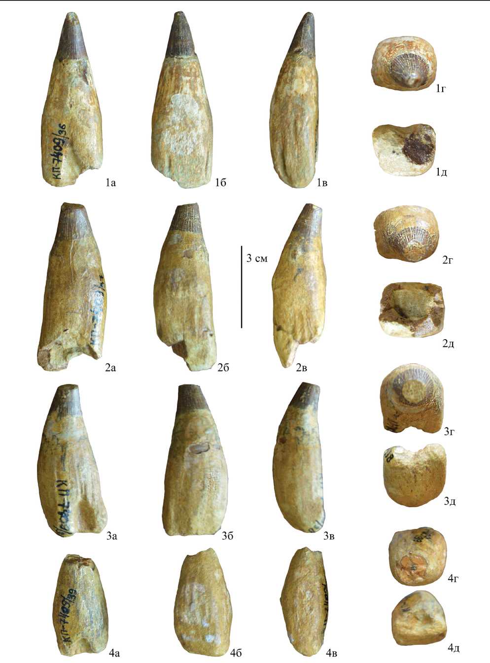 Фиг. 1–4. Platypterigius sp. indet.: 1, 2 – экз. МОИКМ, №КП-7409/36–37, зубы из передней и средней частей челюсти; 3, 4 – экз. МОИКМ, №КП-7409/38–39, зубы из задней части челюстей (а – лингвально, б – лабиально, в – спереди, г – апикально, д – основание корня); Казахстан, Мангистауская обл., разрез Тушыбек; нижний мел, альб.