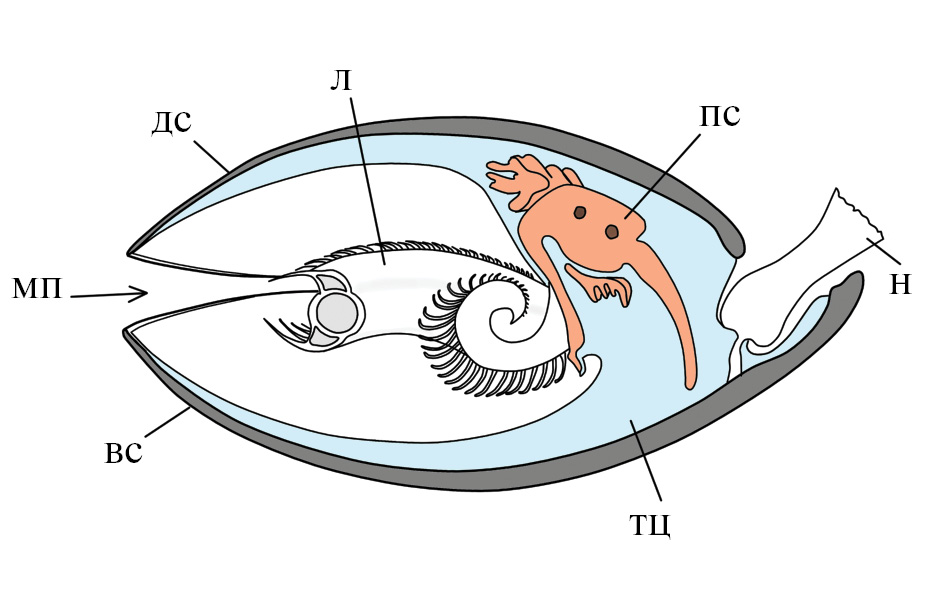 Рис. 1. Схема анатомии брахиопод на примере представителей отряда Terebratulida, вид сбоку (гонады, мышцы и метанефридии не отображены; по: James et al., 1992, с изменениями). Обозначения: вс – вентральная створка, дс – дорсальная створка, л – лофофор, мп – мантийная полость, н – ножка, пс – пищеварительная система, тц – туловищный целом.