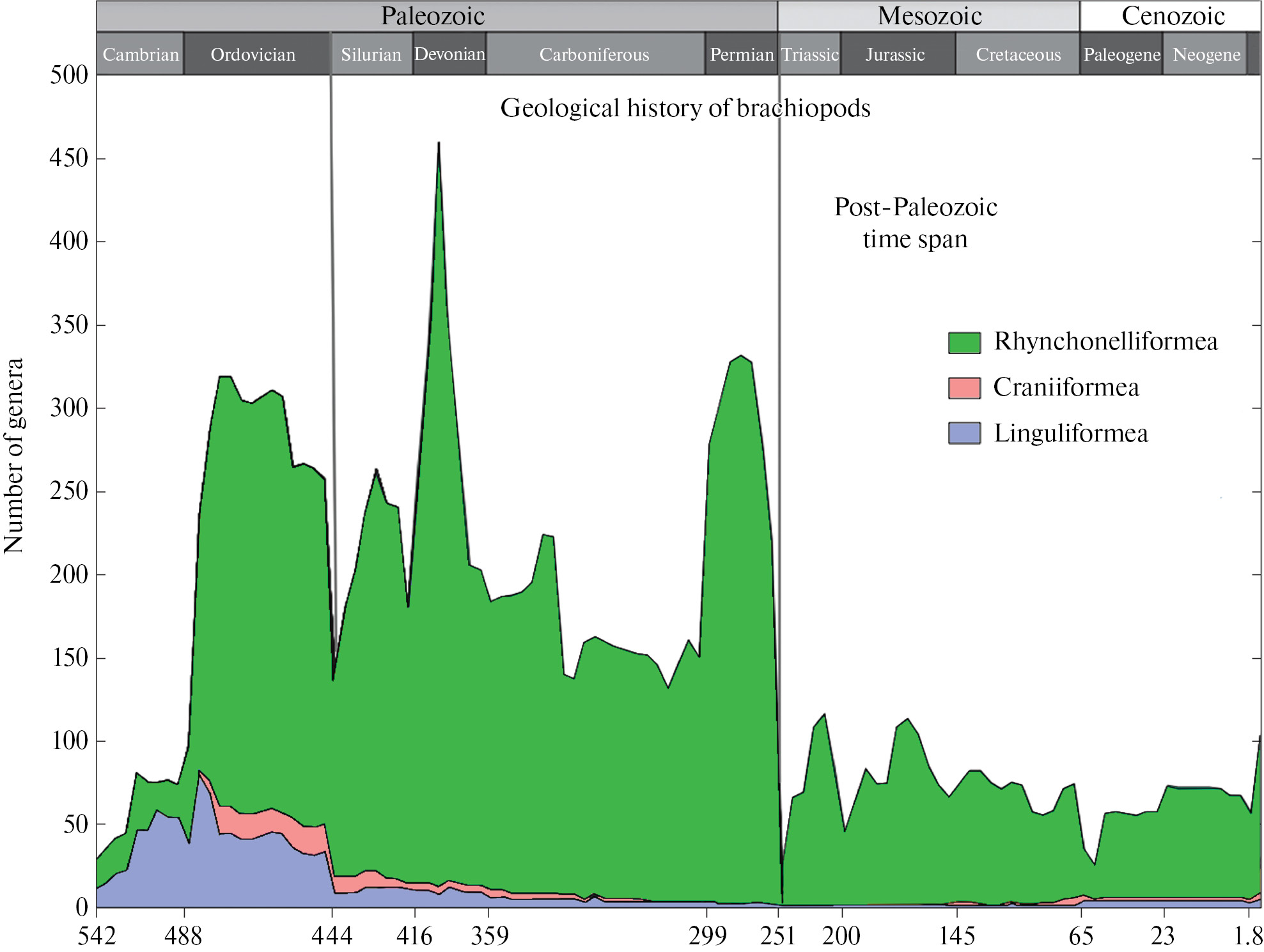 Рис. 2. Родовое разнообразие брахиопод в палеонтологической истории (по: Carlson, 2016, с изменениями).