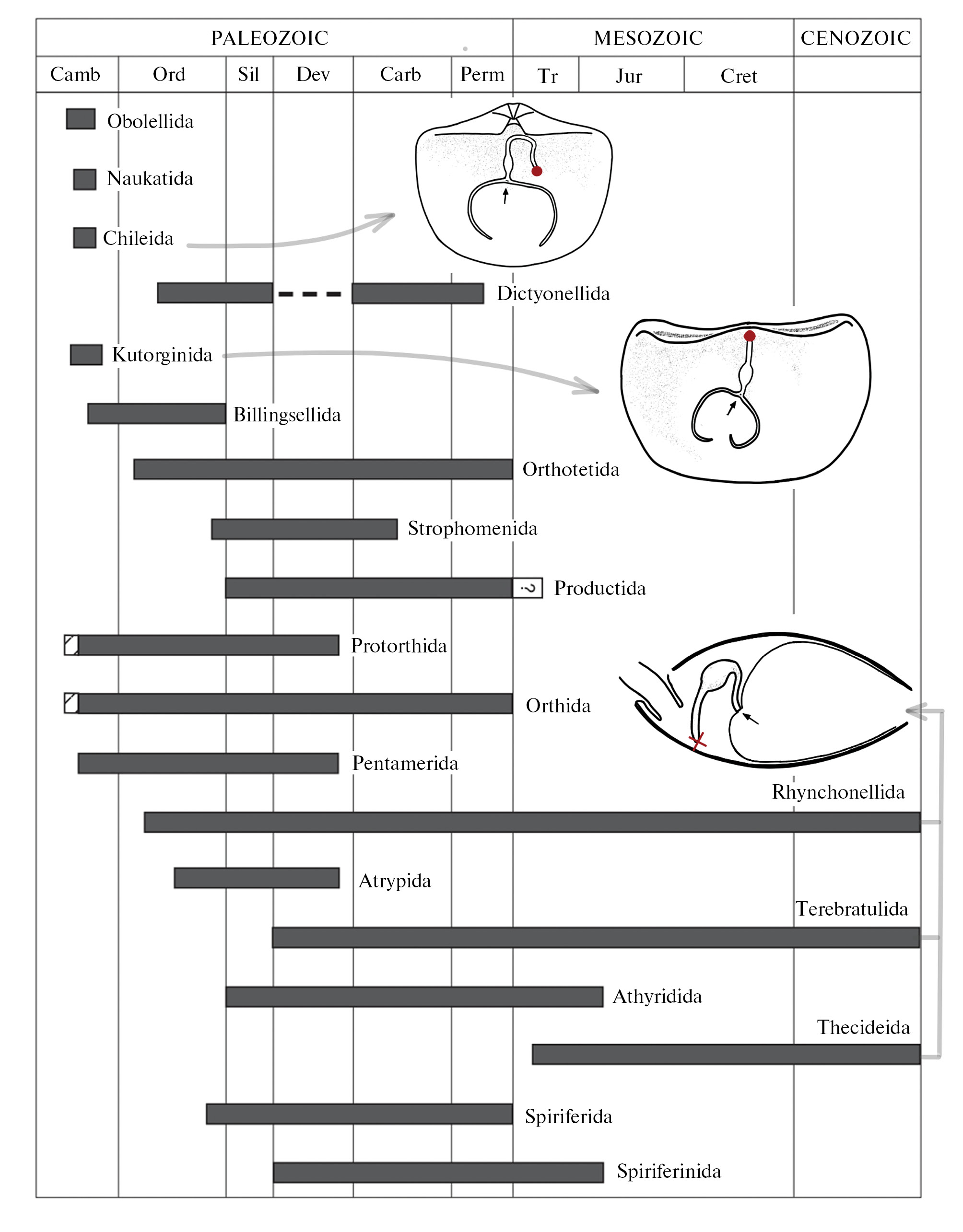 Рис. 4. Эволюция ринхонеллиформных брахиопод (по: Carlson, 2016, с изменениями) и схемы строения пищеварительной системы представителей вымерших отрядов Chileida (вид с вентральной стороны; по: Zhang et al., 2007b, с изменениями), Kutorginida (вид с вентральной стороны; по: Zhang et al., 2007с, с изменениями) и современных отрядов Rhynchonellida, Terebratulida, Thecideida (вид сбоку; по: Nielsen, 1991, с изменениями). Красной точкой обозначено анальное отверстие, крестом – слепое замыкание кишечника. Систематика брахиопод по: Carlson, 2016; Harper et al., 2017.