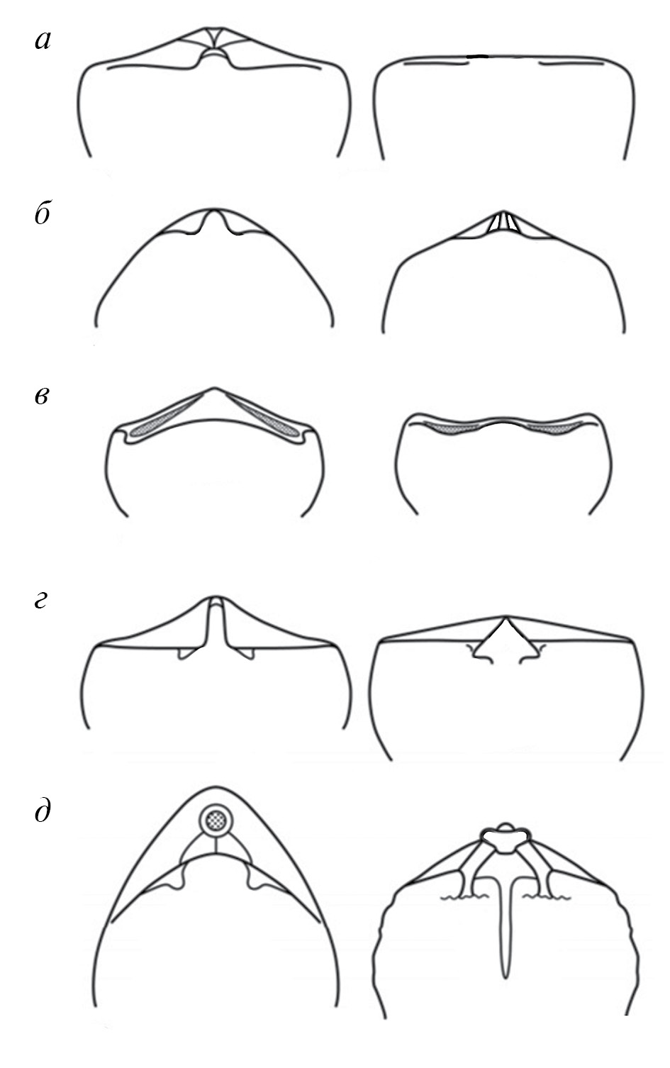 Рис. 5. Схемы строения замковых структур раковины ринхонеллиформных брахиопод на вентральной створке (левый столбец) и дорсальной створке (правый столбец): а – строфические поверхности Chile sp. (Chileata; по: Popov, Holmer, 2000a, с изменениями); б – примитивный замок Obolella sp. (Obolellata; по: Popov, Holmer, 2000b, с изменениями); в – астрофические поверхности Kutorgina sp. (Kutorginata; Popov, Williams, 2000, с изменениями); г – дельтидиодонтный замок Hesperorthis sp., Hebertella sp. (Rhynchonellata; по: Rudwick, 1970, с изменениями); д – циртоматодонтный замок Magellania sp. (Rhynchonellata; по: Clarkson, 1979, с изменениями).