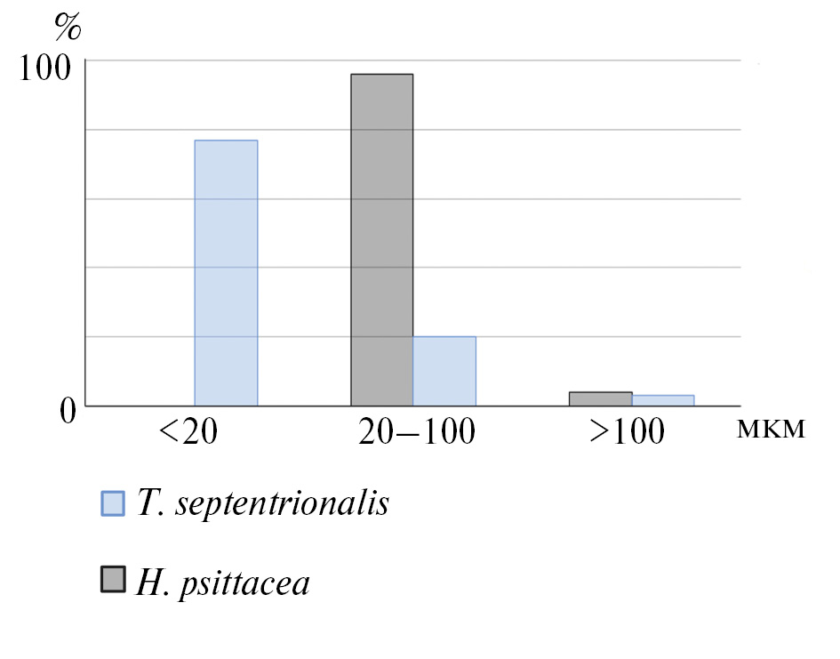 Рис. 7. Размерный диапазон частиц, обнаруженных в пищеварительном тракте ринхонеллиформных брахиопод Hemithiris psittacea и Terebratalia septentrionalis, собранных на глубине до 40 м в фотической зоне (по: McCammon, 1981). По оси y указана доля обнаруженных частиц от общего количества органических частиц в процентах, по оси x – диаметр частиц в мкм.
