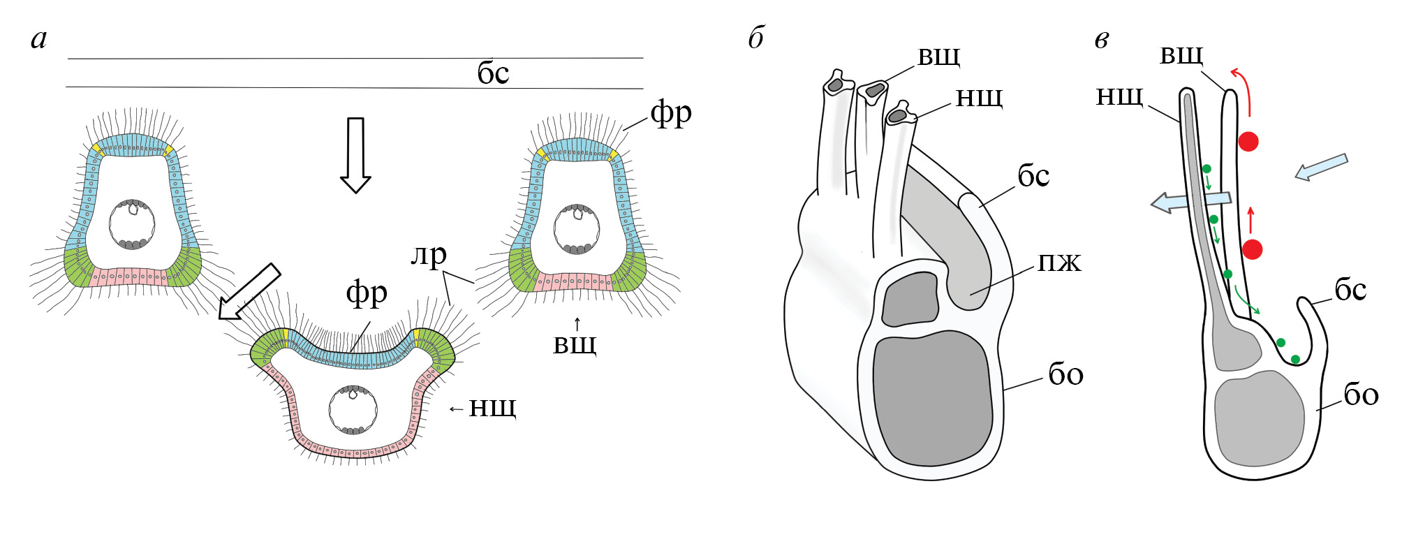 Рис. 8. Организация лофофора брахиопод: а – поперечный срез через щупальца лофофора (по: Kuzmina, Malakhov, 2007); б – поперечный срез через брахиальную ось спиролофного лофофора (по: Kuzmina et al., 2018, с изменениями); в – преимущественная роль внутренних и наружных щупалец в процессе принятия и отторжении частиц. Обозначения: бо – брахиальная ось, бс – брахиальная складка, вщ – внутренние щупальца, лр – латеральные реснички, нщ – наружные щупальца, пж – пищевой желобок, фр – фронтальные реснички. Стрелками обозначено направлние тока воды. Голубым цветом обозначена фронтальная ресничная зона, зеленым – латеральная, розовым – абфронтальная, желтым обозначены чувствительные латеро-фронтальные ресничные клетки.