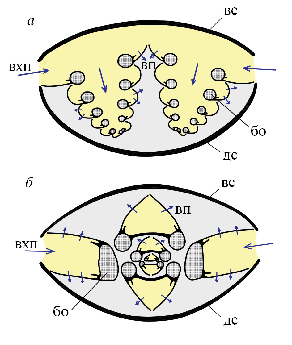 Рис. 9. Организация спиролофного (а) и плектолофного (б) лофофоров (поперечный срез через раковину; по: Rudwick, 1970, с изменениями). Обозначения: бо – брахиальная ось лофофора, вп – выходящий поток, вс – вентральная створка, вхп – входящий поток, дс – дорсальная створка; стрелками обозначены направления потоков воды, выводная камера залита серым цветом, вводная – желтым.