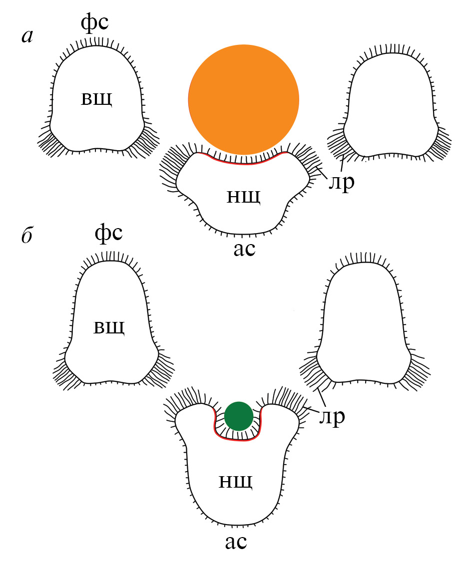 Рис. 12. Поперечный срез через брахиальную ось спиролофного (а) и плектолофного (б) лофофоров (по: Temereva, Kuzmina, 2017; Кuzmina, Temereva, 2018). Внутреннее строение щупалец не отражено. Обозначения: ас – абфронтальная сторона, вщ – внутренние щупальца, лр – латеральные реснички, нщ – наружные щупальца, фс – фронтальная сторона.