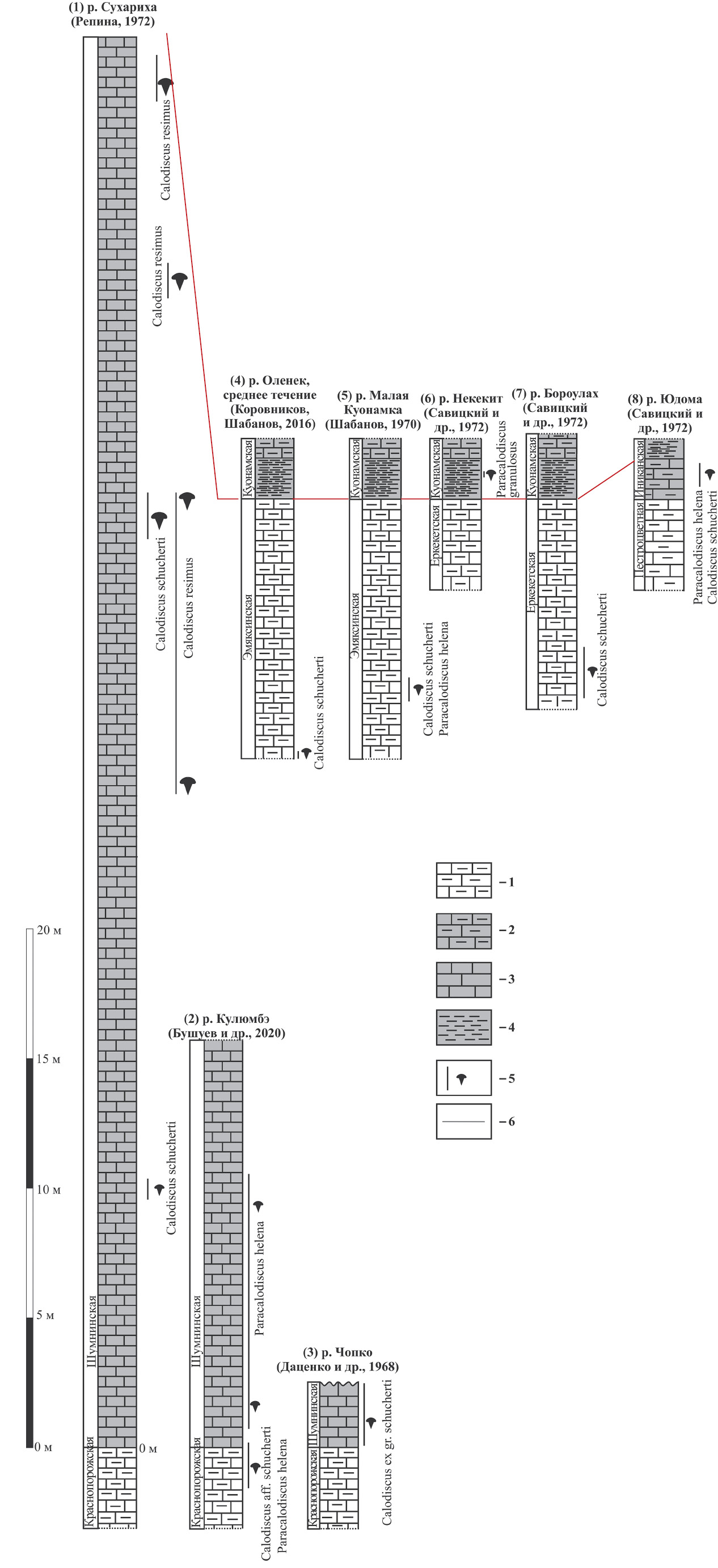 На юго-востоке Сибирской платформы в разрезе на р. Юдома в самых низах иниканской свиты примерно в одном метре от подошвы встречены Calodiscus aff. schucherti и Paracalodiscus helena (Савицкий и др., 1972) (рис. 2). Они найдены в сравнительно узком интервале (0.6 м) совместно с трилобитами, которые указывают на принадлежность этого интервала к низам ботомского яруса. Находки приурочены к сильно глинистым известнякам, мергелям зеленовато-серым, коричневатым до черных.