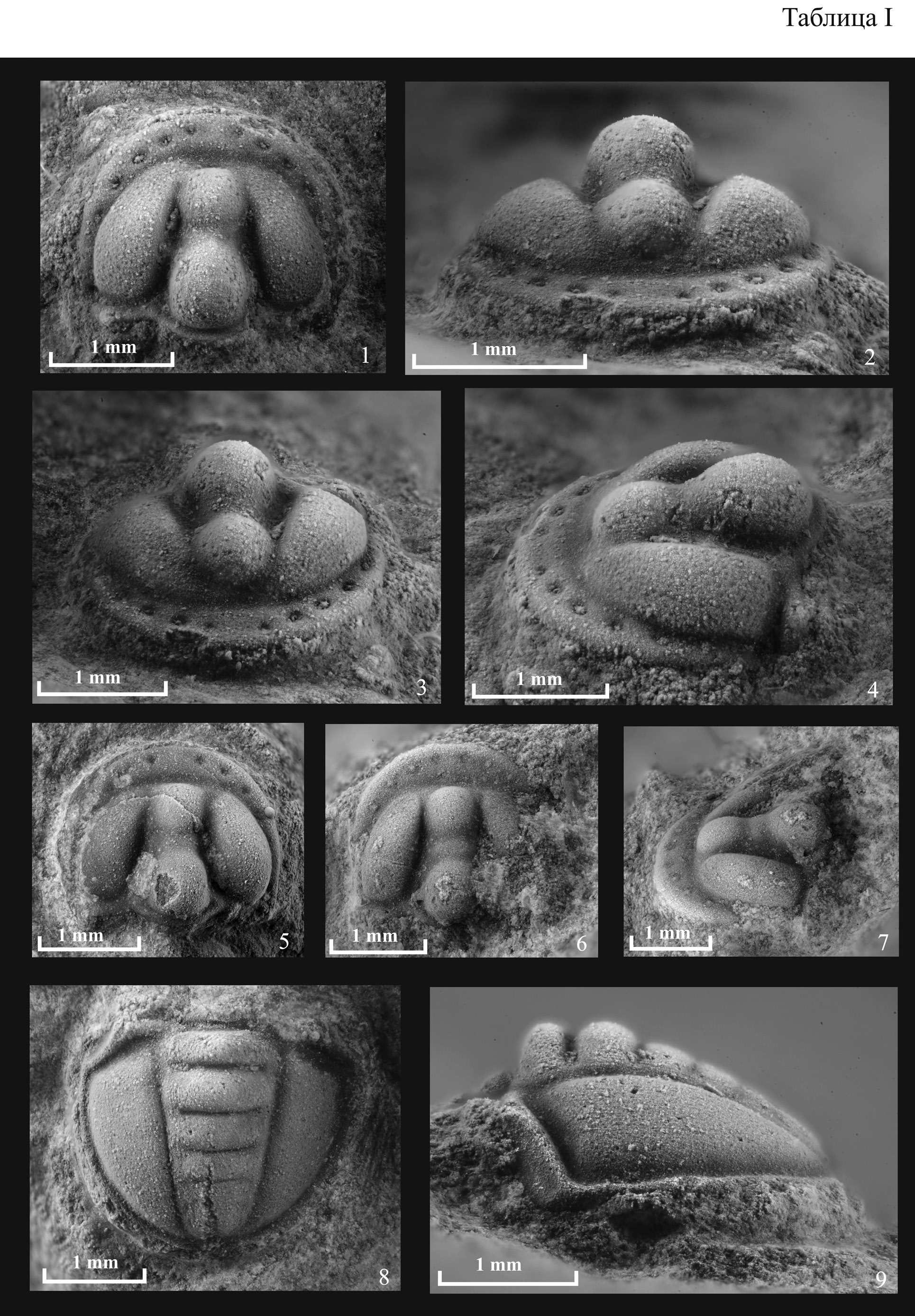 Описание (рис. 3, к, л). Цефалон полукруглых очертаний, умеренно выпуклый. Глабель слабо суживается вперед, разделена срединной широкой депрессией на три части. Передняя часть выпуклая, округлой формы, почти доходит до краевой борозды. Средняя часть глабели имеет вид широкой седловины. Задняя часть широкая, сильновыпуклая посередине. Щеки слабовыпуклые, по ширине сопоставимы с шириной глабели в ее средней части. Глабель обособлена широкими и глубокими боковыми бороздами. Краевая борозда широкая; передняя краевая кайма уплощенная, широкая напротив фронтальной лопасти глабели и суживается по бокам цефалона и далее к заднему краю. В дополнение к мелким бугоркам на поверхности цефалона, вдоль передней краевой каймы наблюдаются четыре-пять последовательно расположенных более крупных бугорков. Затылочное кольцо очень узкое.