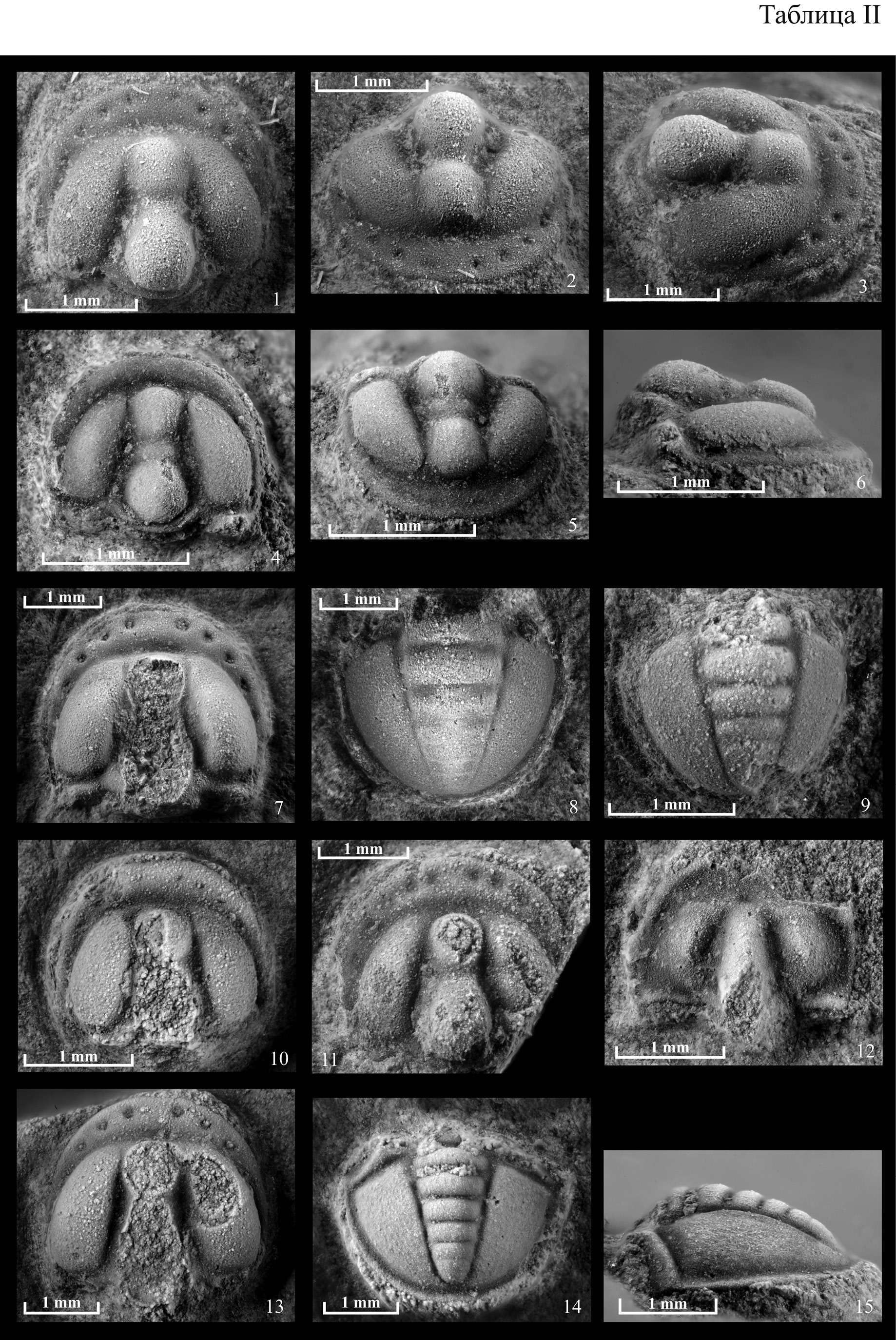 Фиг. 1–11, 13–15. Paracalodiscus helena (Walcott, 1889): 1–3 – экз. 19–II–1b_1, цефалон: 1 – вид сверху, 2 – вид спереди, 3 – вид сверху–сбоку; 4–6 – экз. 19–II–3b_1, цефалон: 4 – вид сверху, 5 – вид спереди–сверху, 6 – вид сбоку; 7, 8 – экз. 19–II–1а_1: 7 – цефалон, вид сверху, 8 – пигидий, вид сверху; 9 – экз. 19–II–1b_4, пигидий, вид сверху; 10 – экз. 19–II–1b_5, цефалон, вид сверху; 11 – экз. 19–II–1b_7, цефалон, вид сверху; 13 – экз. 19-II-1b_3, цефалон, вид сверху; 14, 15 – экз. 19-II-3b_9, пигидий: 14 – вид сверху, 15 – вид сбоку; Сибирская платформа, р. Кулюмбэ; низы шумнинской свиты.
