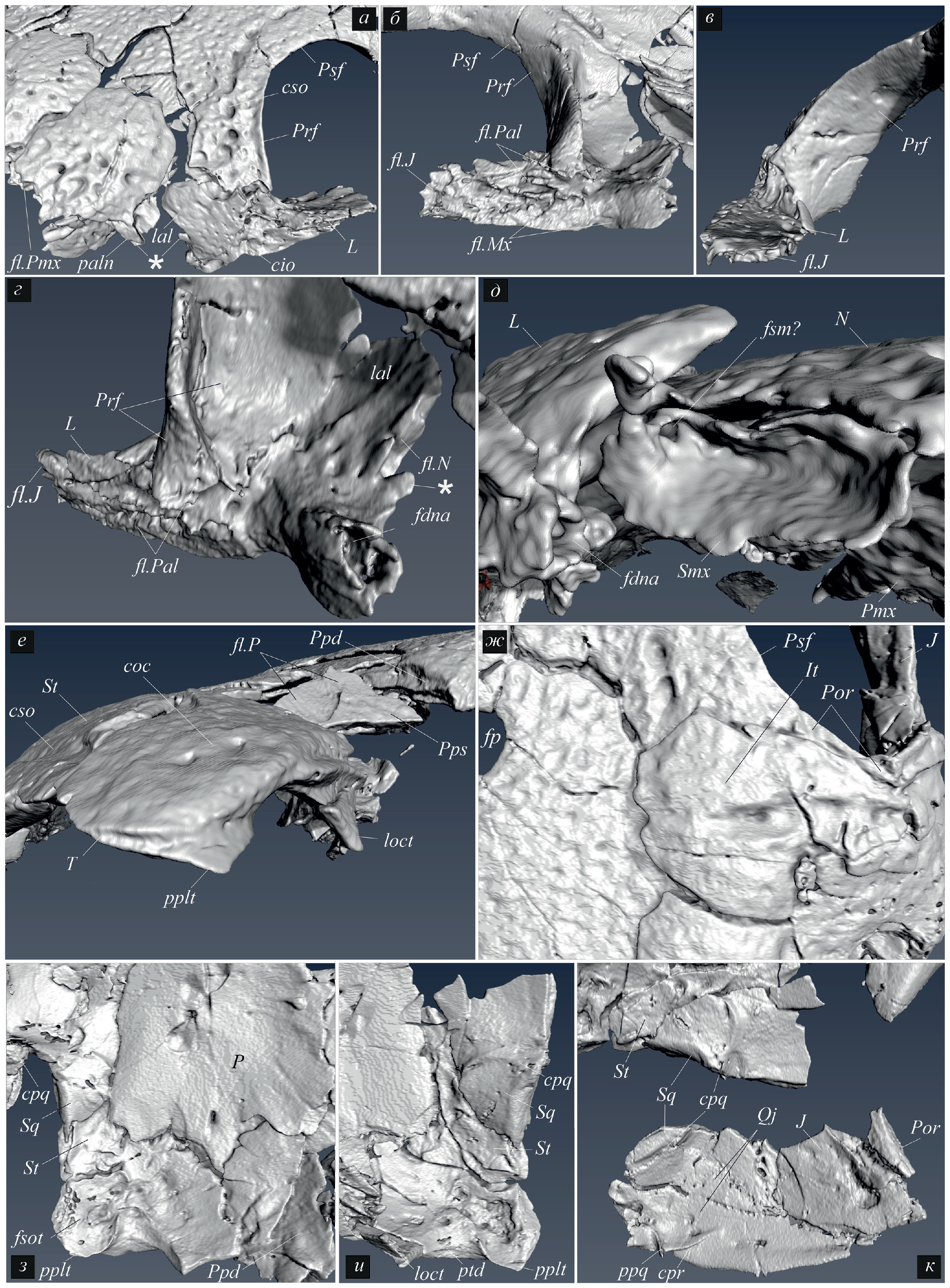 Рис. 4. Volgerpeton exspectatus gen. et sp. nov., голотип ПИН, № 5303/131, детали морфологии черепа, КТ-реконструкция: а – левая преорбитальная область, латеродорсально; б – тот же отдел, вентрально; в – характер сочленения praefrontale и lacrimale в антеровентральном углу орбиты, вид сзади; г – левая преорбитальная область, антеромедиально; д – правое septomaxillare, вид спереди, каудодорсально; е – левое tabulare, постеролатерально; ж – заглазнично-височная область правой стороны, дорсально; з – затылочно-височная область правой стороны, вентрально; и – затылочно-височная область левой стороны, вентрально; к – левый скуловой отдел, медиально. Обозначения: coc – затылочная комиссура сейсмосенсорной системы, cpq – параквадратный гребень (crista paraquadrata) чешуйчатой кости; cpr – предквадратный гребень (crista praequadrata) квадратноскуловой кости; fdna – переднее (дистальное) отверстие слезно-носового протока; fl. (J, Mx, N, P, Pal, Pmx) – фланги причленения перечисленных костей; fsot – поверхность прилегания слуховой капсулы; lal – восходящая пластина слезной кости; P – теменная кость; pplt – постеролатеральный отросток таблитчатой кости (рудиментарный); ppq – параквадратный отросток квадратноскуловой кости (pr. paraquadratus); ptd – свод задневисочной впадины; остальные как на рис. 3. Звездочкой обозначены отросток у основания восходящей пластины слезной кости и соответствующая ему выемка на окончании антеролатерального отростка носовой кости.