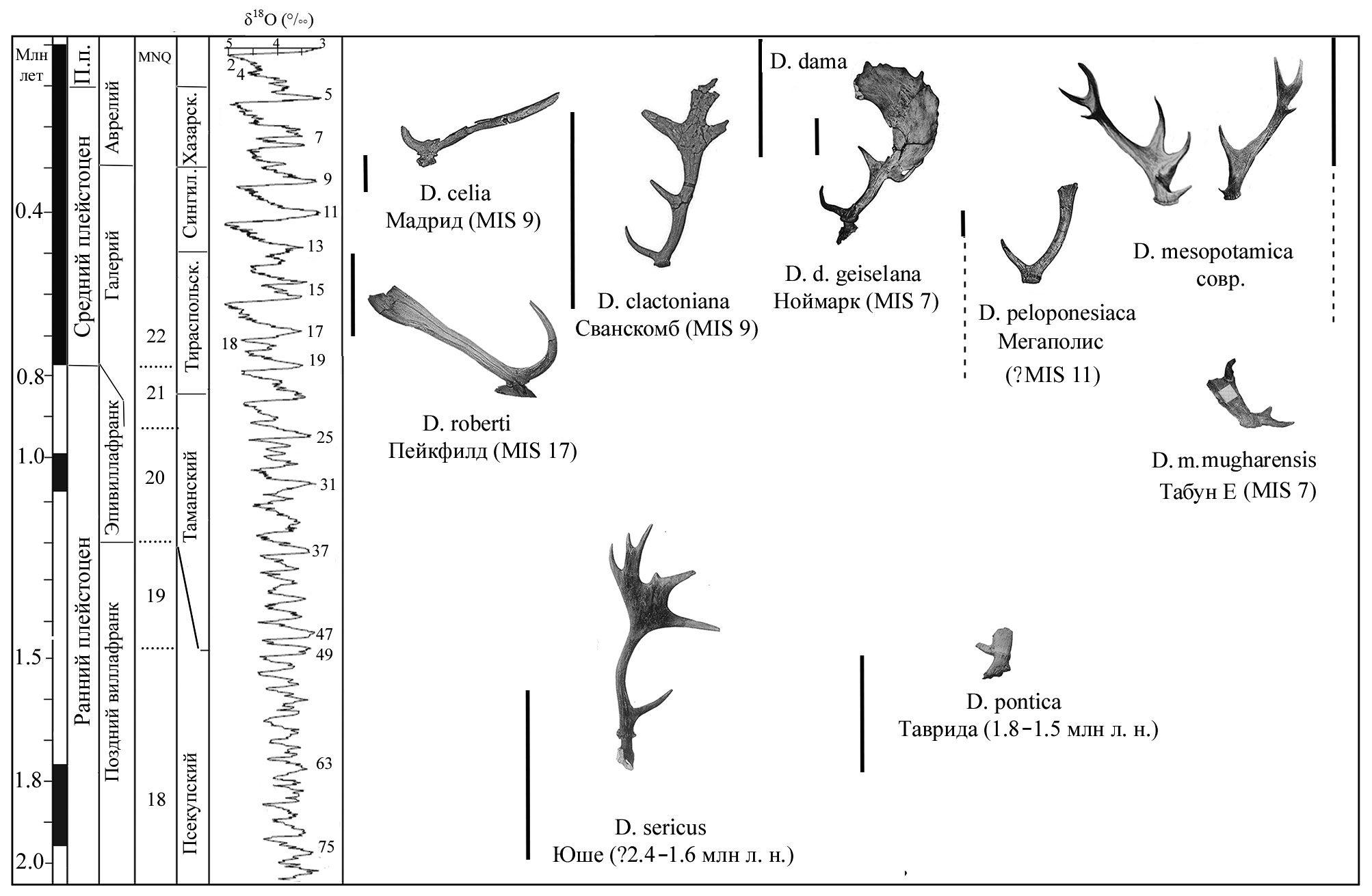 Присутствие в раннем плейстоцене Крыма D. pontica sp. nov., древнейшей в Европе лани с уплощенными рогами, представляет особый интерес для анализа направлений эволюции рода Dama (s.s.) и оценки времени ключевых дивергенций, в т.ч. дивергенции линий, ведущих к европейской лани D. dama и к месопотамской лани D. mesopotamica. Новые данные из Тавриды позволяют обсудить некоторые аспекты эволюции рода Dama, связанные с этими вопросами. Хронологическое положение видов приведено на рис. 2.