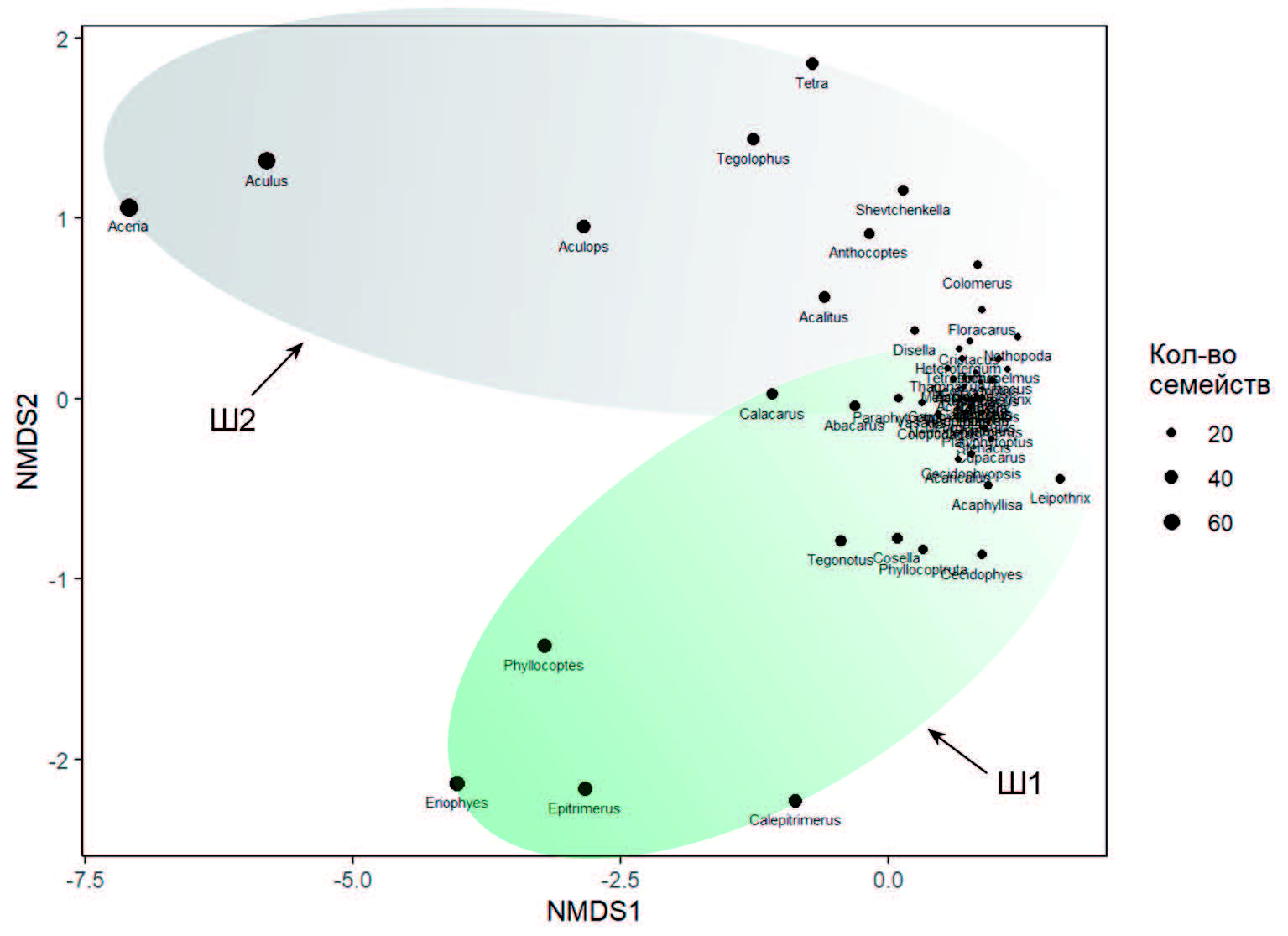 В ходе сравнительного анализа модельных СКВГЭ мы регулярно отмечали принадлежность таксонов галловых клещей к четырем морфогруппам – A, E, P1 и P2. В ходе анализа гостальных связей клещей из разных родов сем. Eriophyidae c растениями на уровне семейств хозяев мы попытались определить, существует ли между этими морфогруппами взаимное сходство по признаку гостальных предпочтений, наподобие описанного выше морфологического сходства (E+P1, A+P2, рис. 1). Распределение родов галловых клещей сем. Eriophyidae в двумерном пространстве, полученное в ходе NMDS анализа матрицы М2, показано на рис. 4. Взаимное расположение родов клещей (точки на плоскости) отражает степень сходства и различия их связей с семействами растений-хозяев и выражено в геометрическом расстоянии между точками. Заметны сгущение точек (ядро) в правой части рисунка и два разнонаправленных «шлейфа» (Ш) слева от этого сгущения: один (Ш1), уходящий в левую нижнюю часть, а другой (Ш2) – в левую верхнюю часть двухмерного пространства. Ядро представляет гетерогенную группу сильно сближенных точек, соответствующих относительно небольшим родам из разных подсемейств галловых клещей. Наиболее удалены от ядра крупные роды Aceria, Aculus, Eriophyes и Epitrimerus. Шлейфы Ш1 и Ш2 четко различаются по таксономическому положению входящих в них родов клещей и соответствуют попарным комбинациям групп A, E, P1 и P2: Ш1 представлен главным образом родами групп E (Eriophyes) и P1 (Phyllocoptes, Epitrimerus, Calepitrimerus), а Ш2 – родами из групп A (Aceria) и P2 (Aculus, Aculops, Tegolophus, Tetra). Таким образом, результаты проведенного анализа указывают на попарное сходство гостальных связей родов клещей из групп E/P1 и A/P2 на уровне семейств растений-хозяев.