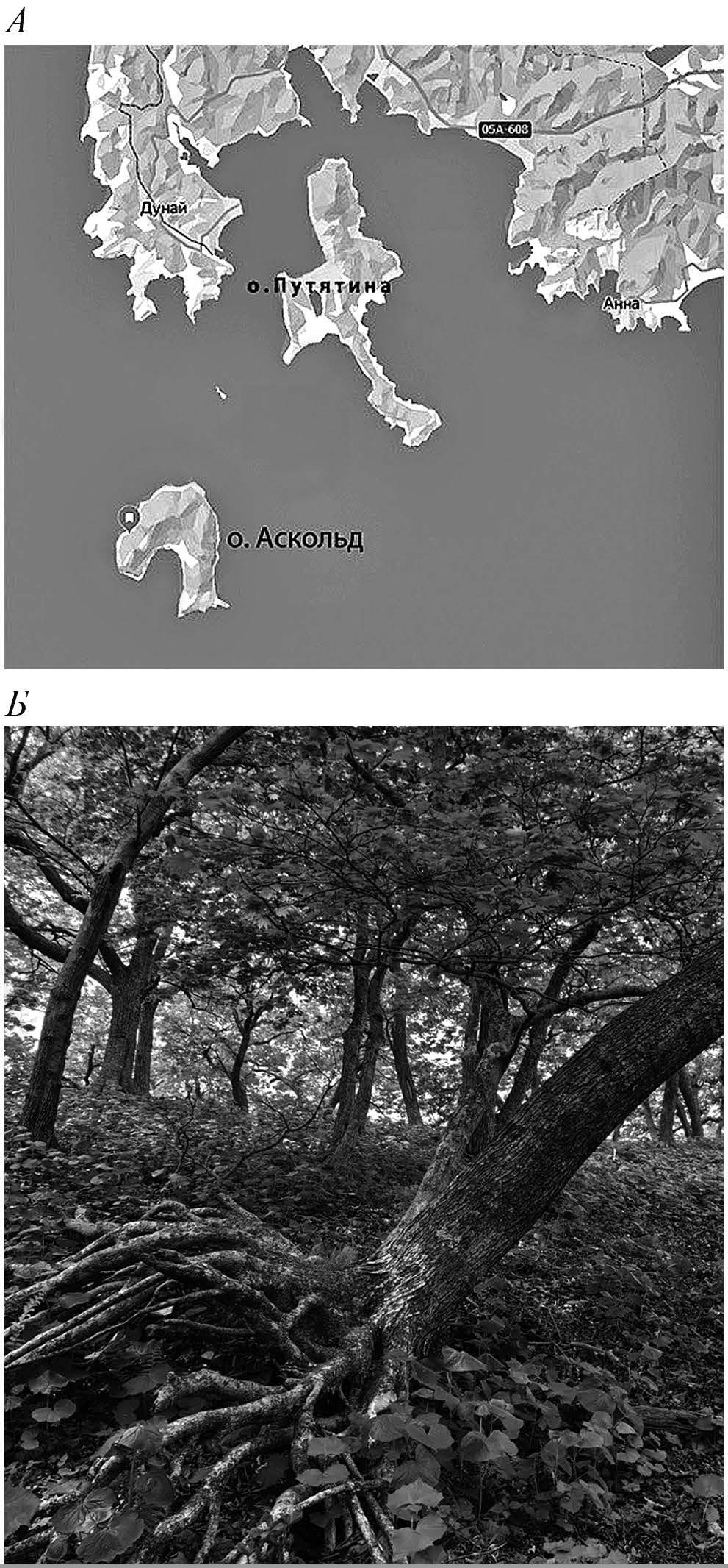 Остров Аскольд имеет гористый рельеф и представляет собой подковообразно изогнутый высокий хребет с крутыми каменистыми склонами, которые покрыты широколиственными лесами (рис. 1А). На острове есть несколько пресных родников (Шереметьев, 2001).