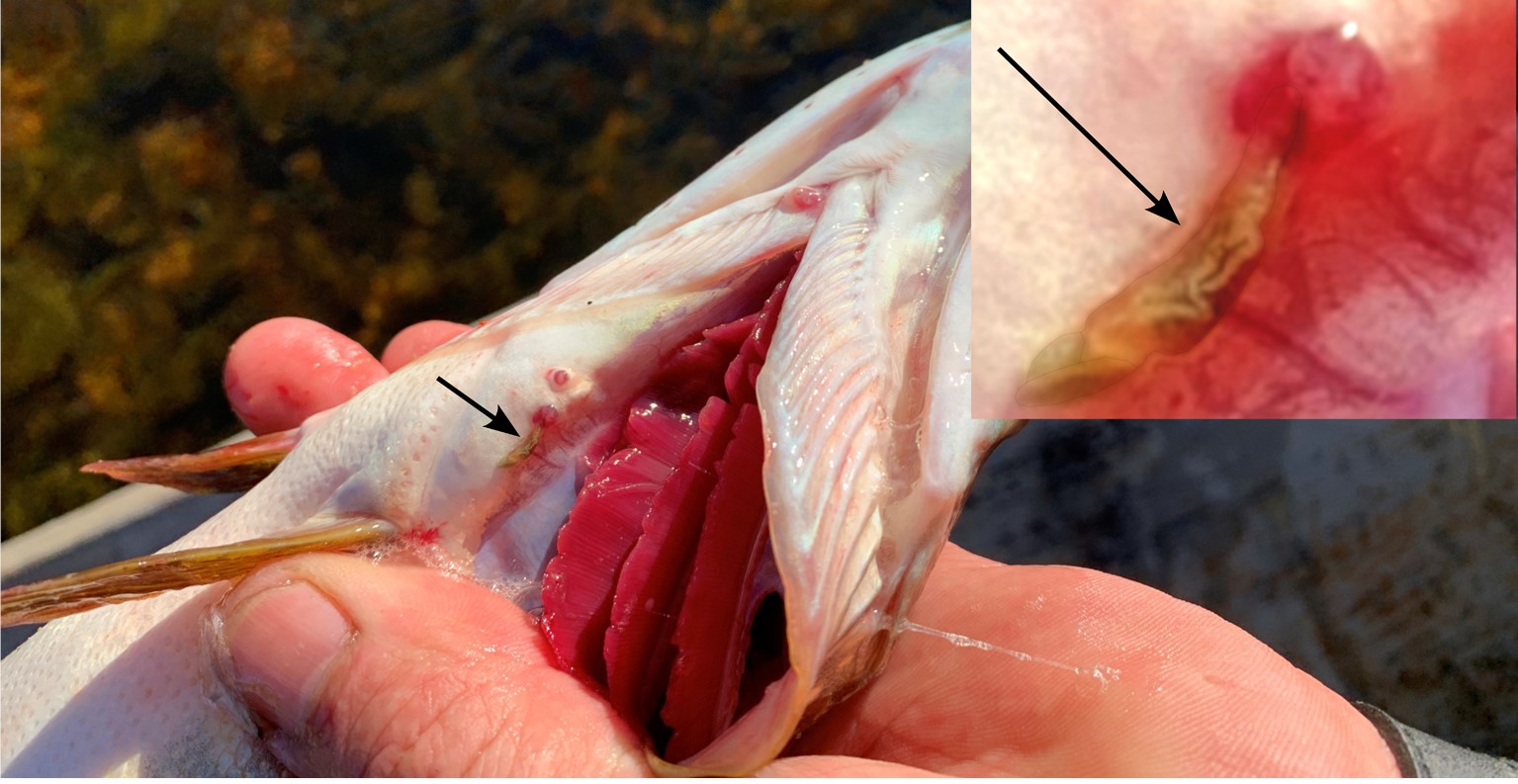 Figure 1. Pike with an attached individual of Lernaea cyprinacea L., 1758, one individual was removed.