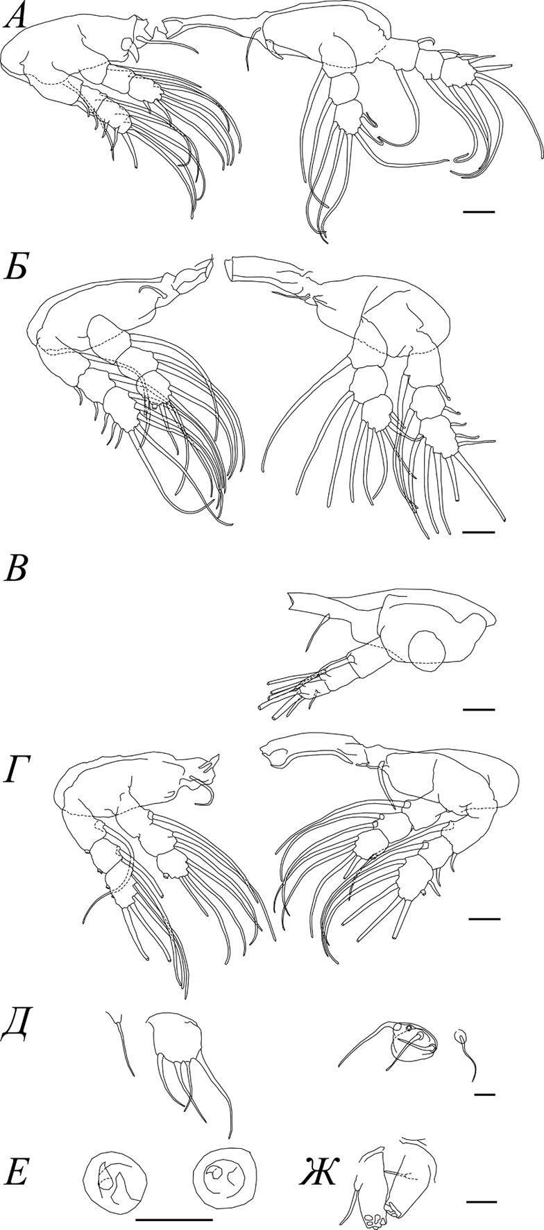 Figure 4. 1–6 pairs of legs and furcal rami of Lernaea cyprinacea L., 1758: A – First pair of legs; Б – Second pair of legs; В – Fragment of a leg of the third pair; Г – Leg of the fourth pair; Д – Fifth pair of legs; Е – Sixth pair of legs; Ж – Furcal rami. Scale bar, µm: А–Д, Ж – 20; Е – 10.