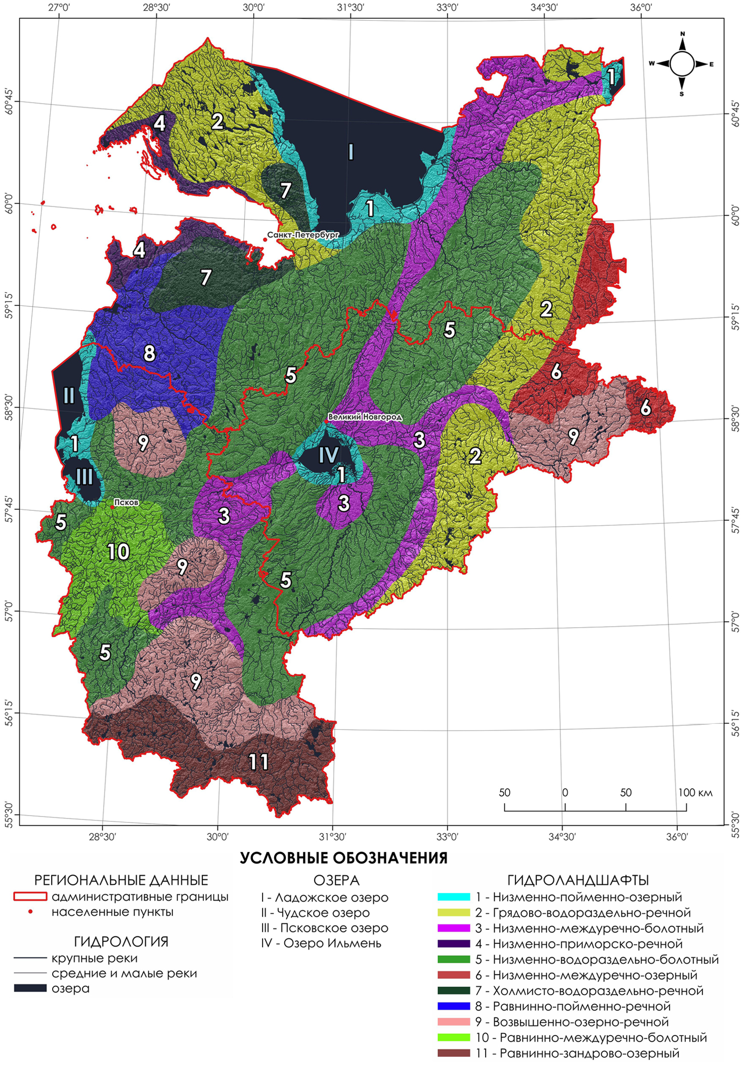 Figure 1. Scheme map of hydrolandscape zoning of the territory of the Leningrad, Pskov and Novgorod regions.
