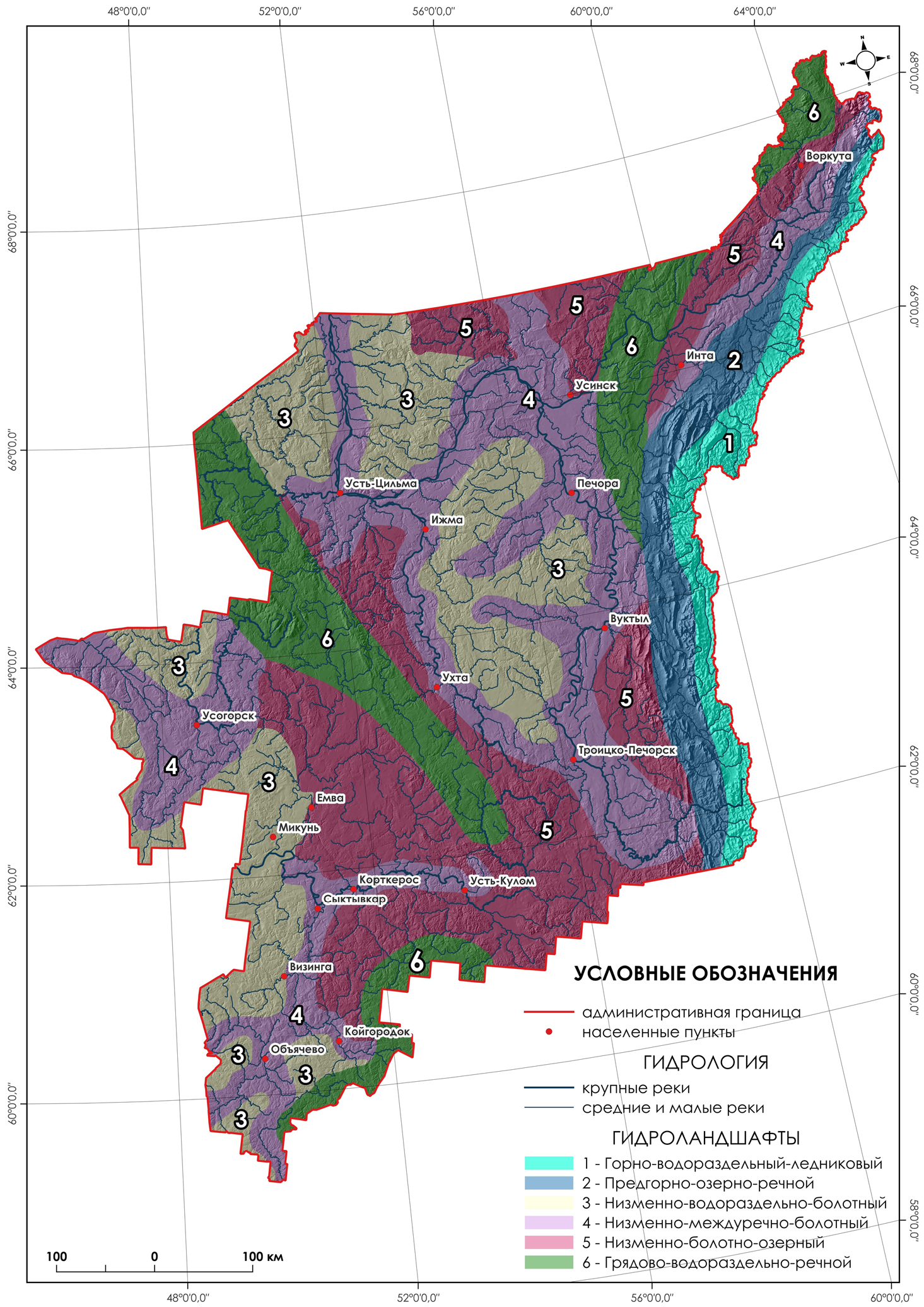 Figure 2. Scheme map of hydrolandscape zoning of the territory of the Komi Republic