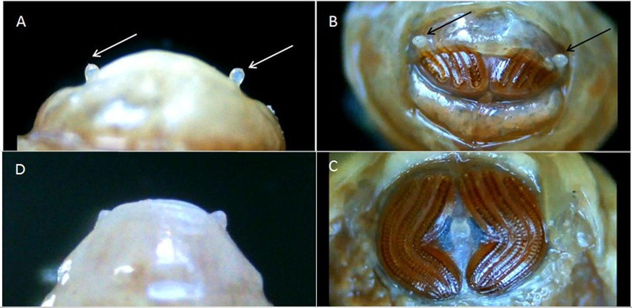 Figure 8. The posterior spiracles in the larvaes G. intestinalis and G. nasalis: A – G. intestinalis, the 3rd stage of development, view from above – well-developed lateral warts on the lower flap of the respiratory cavity (indicated by arrows); В – G. intestinalis, the 3rd stage of development, rear view – lateral warts (indicated by arrows); С – G. intestinalis the 3rd stage of development, rear view (the horizontal flaps are prepared) – posterior spiracles and respiratory slits; D – G. nasalis 2nd stage of development, view from above, lateral warts.