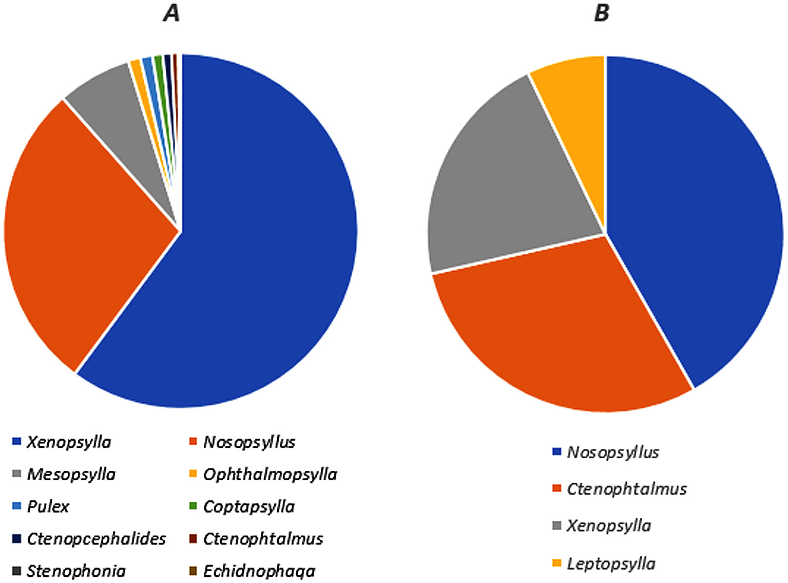 Figure 1. Species representation of fleas depending on climatic conditions: A – territories with a milder climate (Absheron-Gobustan, Mil-Karabakh, Bozchol, Eastern and Western Jeyranchel, Shirvan); B – territories with a colder climate (Kilazi semi-desert, Sitalchay)