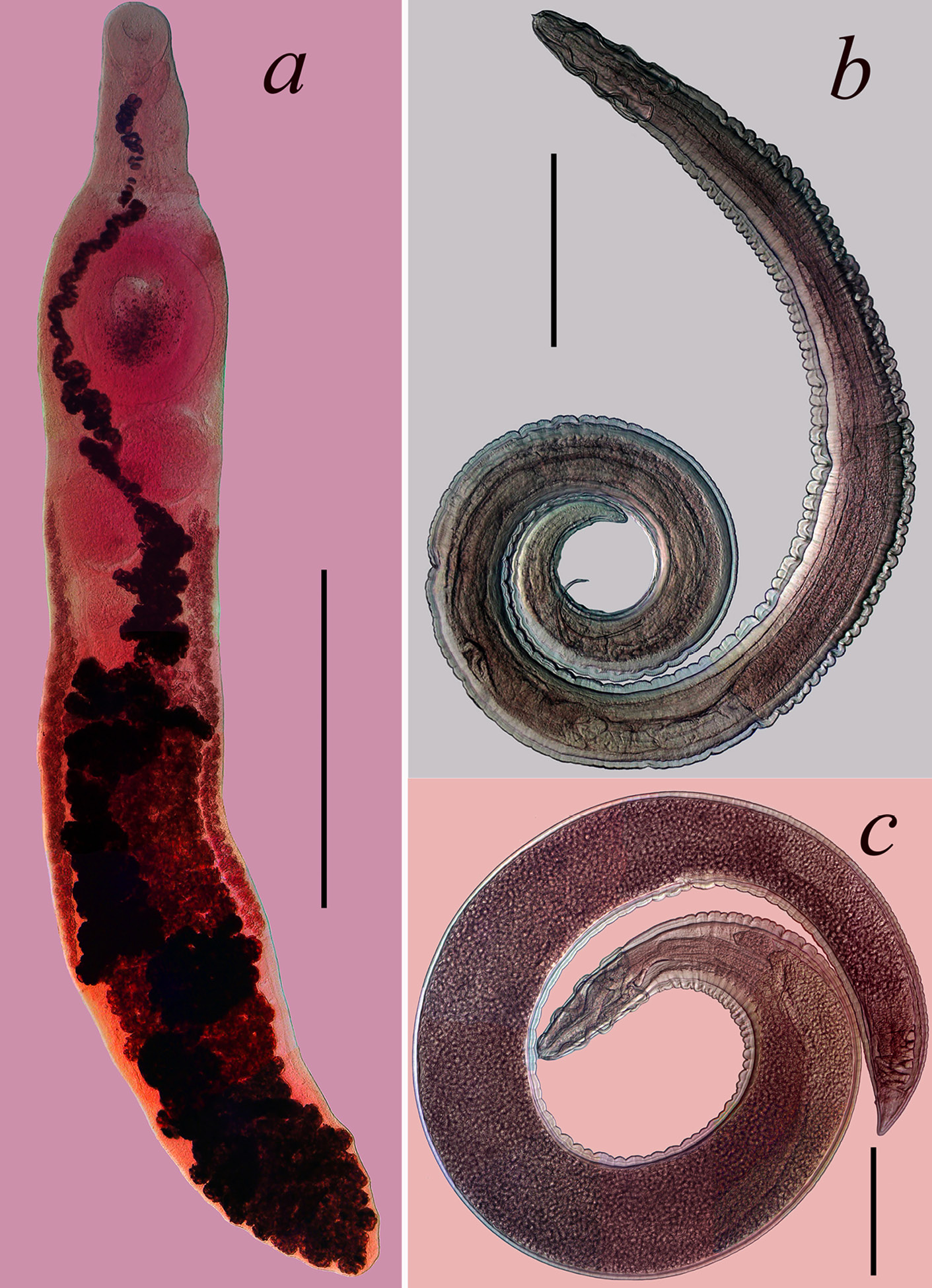 Figure 1. Lyperosomum alaudae and Dispharynx nasuta from Scolopax rusticola: a – Lyperosomum alaudae, whole view; b – Dispharynx nasuta male, whole view; c – Dispharynx nasuta female, whole view. Scale bars, mm: a – 1.0; b, c – 0.5