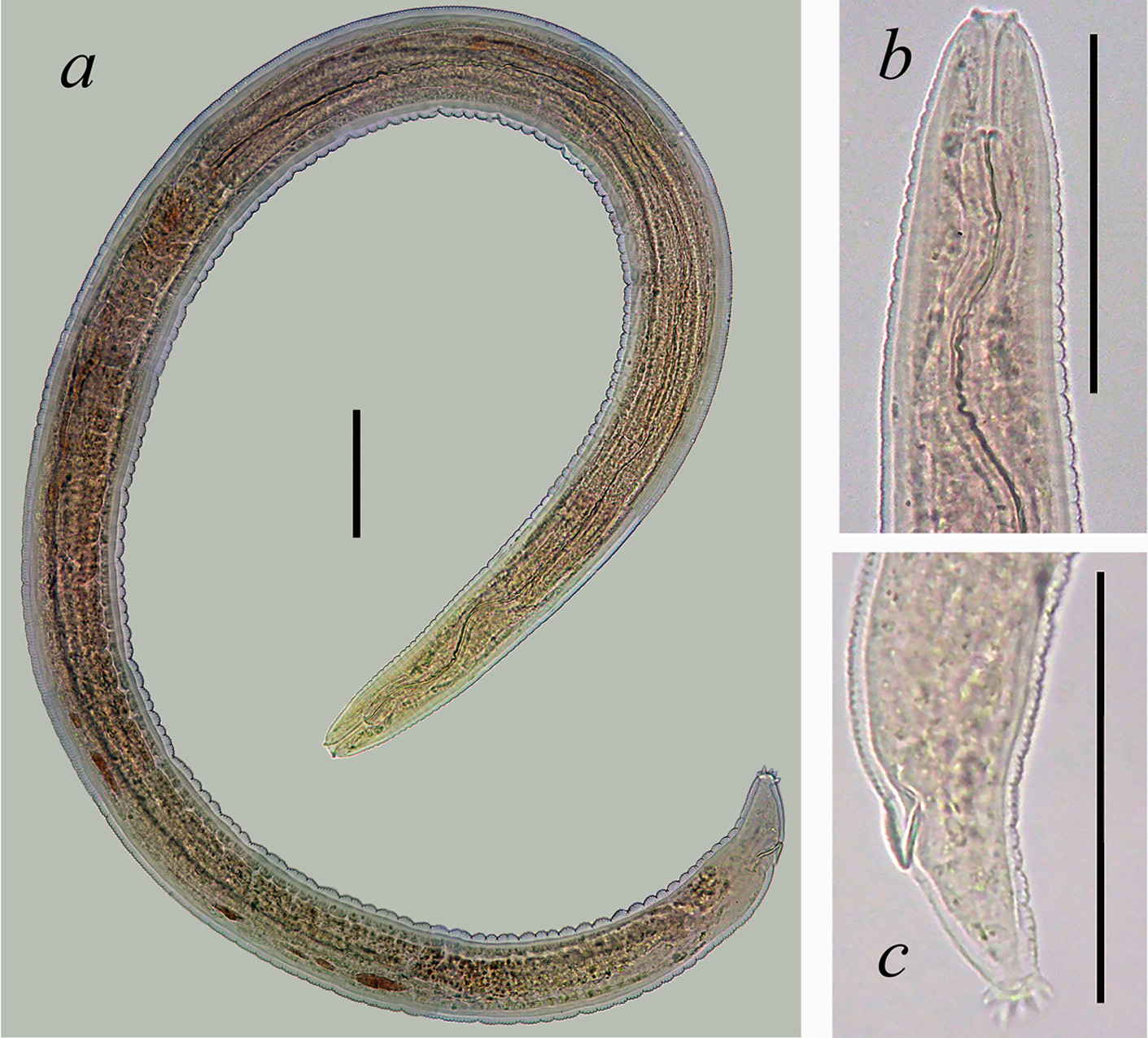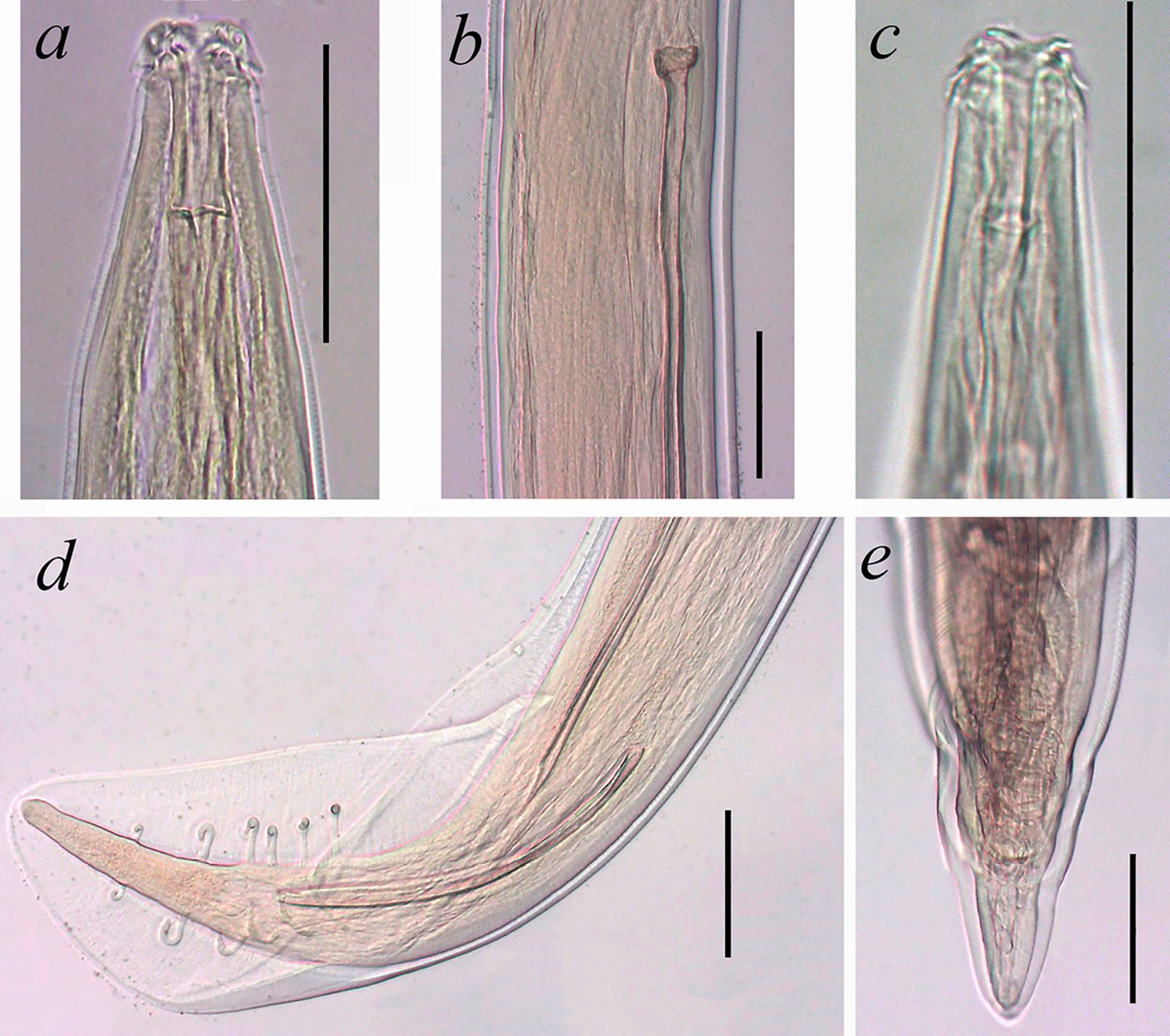 Morphological description of Dispharynx nasuta (based on 6 males and 7 females) (Fig. 1b, 1c). Body yellowish-white. Cuticle transversely striated. Mouth with two triangular lips. Four convoluted prominent cordons extend from lips base, two on ventral side and two on dorsal side, at distal ends curve back toward anterior extremity. Oesophagus consists of two parts: anterior muscular and posterior glandular.