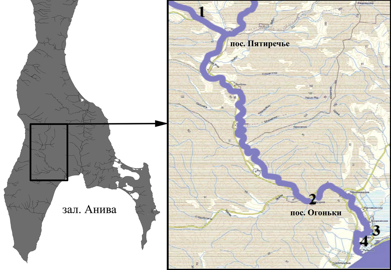 Рисунок 1. Карта-схема участков сбора паразитологического материала: ритраль-эпиритраль (станция № 1), мезоритраль (станция № 2), эстуарная зона (станция № 3), пойменное озеро (станция № 4)