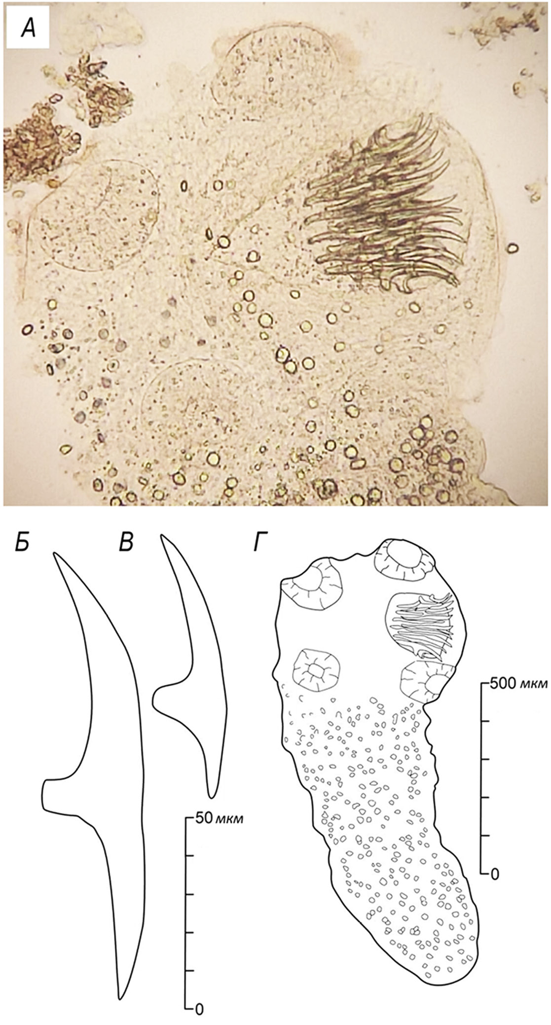 Figure 1. А – photo of the merocercoid Paradilepsis scolecina from the liver of the roach of the Angara River; Б – a large rostellar hook; B – a small rostellar hook; Г– a general view of the merocercoid