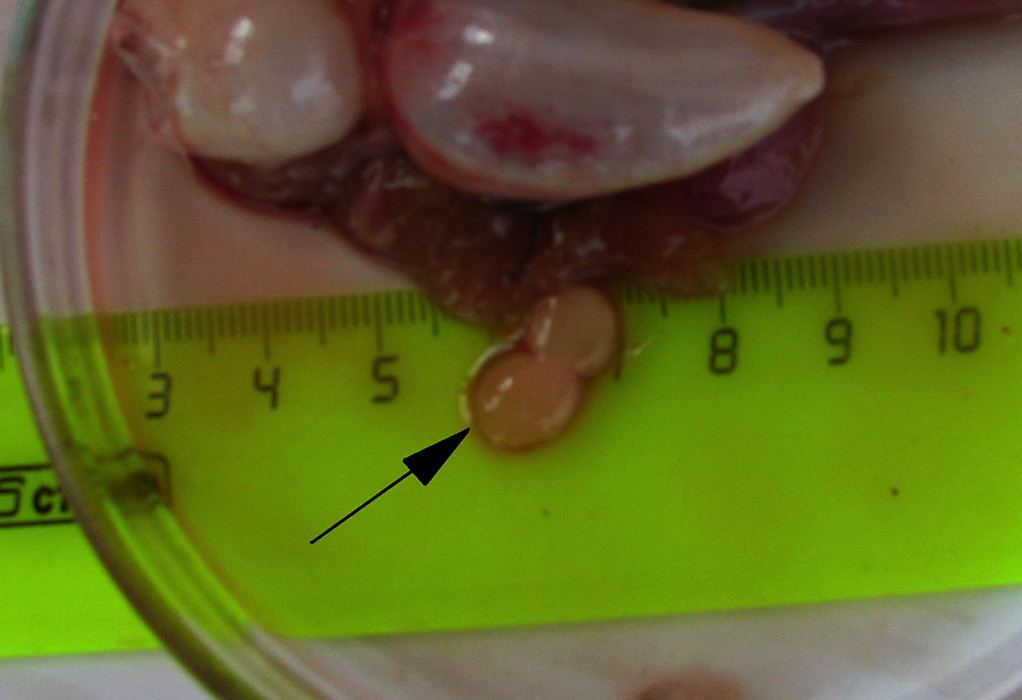 Рисунок 1. Плазмодии Myxobolus pronini (стрелка) в брюшной полости серебряного карася