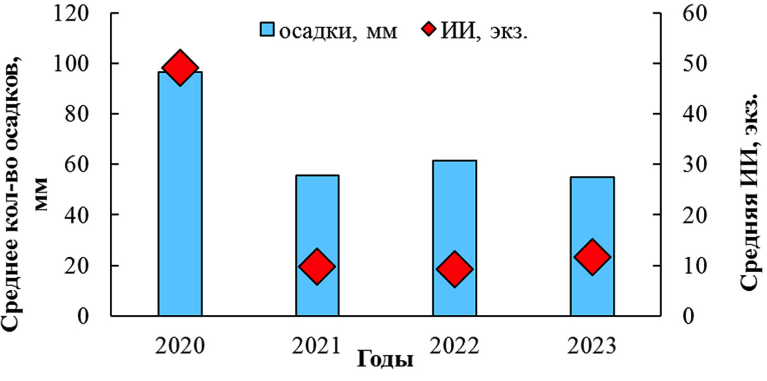 Также количество осадков в разные месяцы в период с мая по сентябрь в 2020 г. достоверно выше, чем в другие годы (рис. 4). Таким образом, и ИИ в период с мая по сентябрь в 2020 г. достоверно выше, чем в другие годы.
