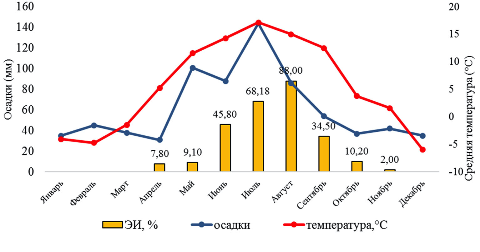 Из рис. 5 видно, что в 2020 г. наблюдалось максимальное годовое количество атмосферных осадков – 736 мм. Пик осадков (144 мм) и максимальные средние температуры зарегистрированы в июле. Таким образом, наибольшая ЭИ (88%) зарегистрирована в августе что свидетельствует о благоприятных условиях для развития эктопаразитов.